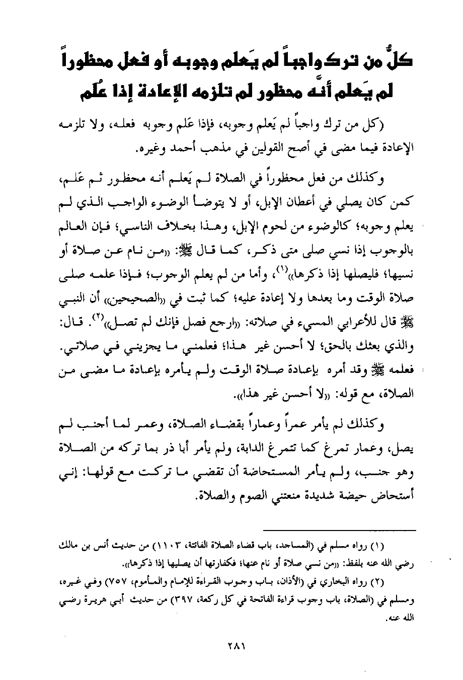 وكذلك من فعل محظوراً في الصلاة لم يَعلم أنه محظور ثم عَلم، كمن كان يصلي في أعطان الإبل، أو لا يتوضأ الوضوء الواجب الذي لم يعلم وجوبه؛ كالوضوء من لحوم الإبل، وهذا بخلاف الناسي؛ فإن العالم بالوجوب إذا نسي صلى متى ذكر، كما قال - صلى الله عليه وسلم -: ((من نام عن صلاة أو نسيها؛ فليصلها إذا ذكرها)) (¬1) ، وأما من لم يعلم الوجوب؛ فإذا علمه صلى صلاة الوقت وما بعدها ولا إعادة عليه؛ كما ثبت في ((الصحيحين)) أن النبي - صلى الله عليه وسلم - قال للأعرابي المسيء في صلاته: ((ارجع فصل فإنك لم تصل)) (¬2) . قال: والذي بعثك بالحق؛ لا أحسن غير هذا؛ فعلمني ما يجزيني في صلاتي. فعلمه - صلى الله عليه وسلم - وقد أمره بإعادة صلاة الوقت ولم يأمره بإعادة ما مضى من الصلاة، مع قوله: ((لا أحسن غير هذا)) .