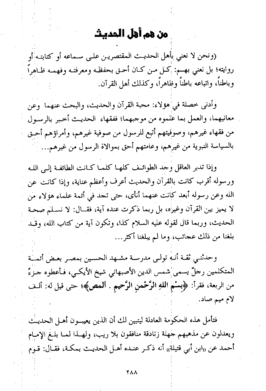 (ونحن لا نعني بأهل الحديث المقتصرين على سماعه أو كتابته أو روايته؛ بل نعني بهم: كل من كان أحق بحفظه ومعرفته وفهمه ظاهراً وباطناً، واتباعه باطناً وظاهراً، وكذلك أهل القرآن.