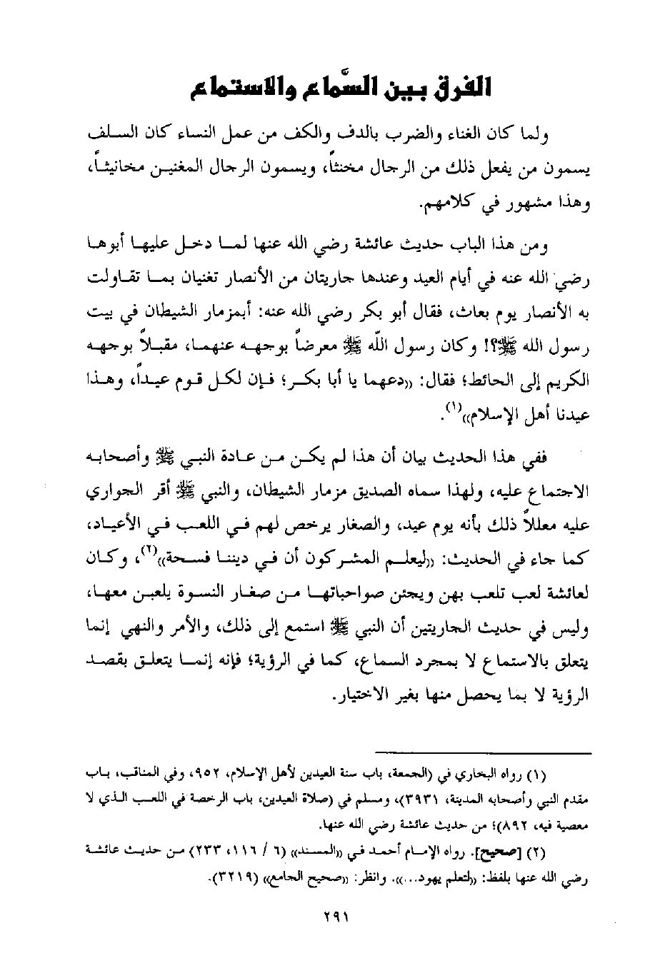 ففي هذا الحديث بيان أن هذا لم يكن من عادة النبي - صلى الله عليه وسلم - وأصحابه الاجتماع عليه، ولهذا سماه الصديق مزمار الشيطان، والنبي - صلى الله عليه وسلم - أقر الجواري عليه معللاً ذلك بأنه يوم عيد، والصغار يرخص لهم في اللعب في الأعياد، كما جاء في الحديث: ((ليعلم المشركون أن في ديننا فسحة)) (¬2) ، وكان لعائشة لعب تلعب بهن ويجئن صواحباتها من صغار النسوة يلعبن معها، وليس في حديث الجاريتين أن النبي - صلى الله عليه وسلم - استمع إلى ذلك، والأمر والنهي إنما يتعلق بالاستماع لا بمجرد السماع، كما في الرؤية؛ فإنه إنما يتعلق بقصد الرؤية لا بما يحصل منها بغير الاختيار.