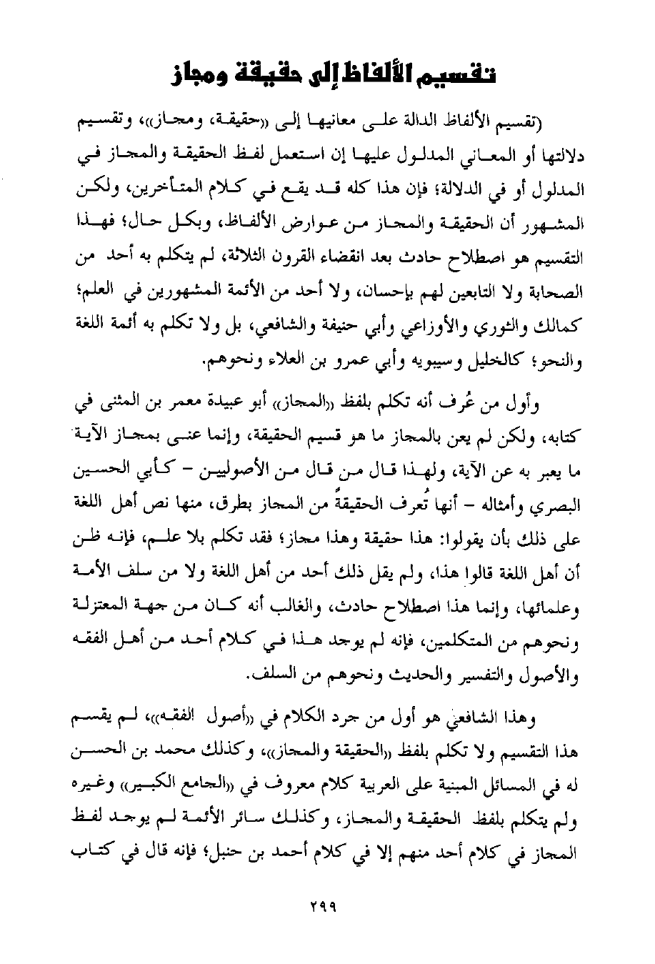 وهذا الشافعي هو أول من جرد الكلام في ((أصول الفقه)) ، لم يقسم هذا التقسيم ولا تكلم بلفظ ((الحقيقة والمجاز)) ، وكذلك محمد بن الحسن له في المسائل المبنية على العربية كلام معروف في ((الجامع الكبير)) وغيره ولم يتكلم بلفظ الحقيقة والمجاز، وكذلك سائر الأئمة لم يوجد لفظ المجاز في كلام أحد منهم إلا في كلام أحمد بن حنبل؛ فإنه قال في كتاب