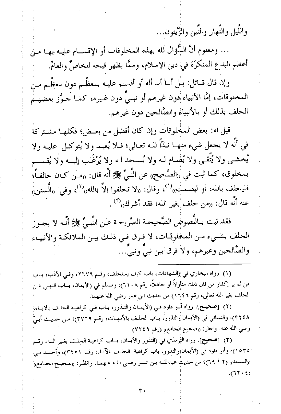 قيل له: بعض المخلوقات وإن كان أفضل من بعض؛ فكلها مشتركة في أنَّه لا يجعل شيء منها ندّاً لله تعالى؛ فلا يُعبد ولا يُتوكل عليه ولا يُخشى ولا يُتَّقى ولا يُصام له ولا يُسجد له ولا يُرْغَب إليه ولا يُقسم بمخلوق، كما ثبت في ((الصَّحيح)) عن النَّبيِّ - صلى الله عليه وسلم - أنَّه قال: ((من كان حالفاً؛ فليحلف بالله، أو ليصمت)) (¬1) ، وقال: ((لا تحلفوا إلاَّ بالله)) (¬2) ، وفي ((الُّسنن)) عنه أنَّه قال: ((من حلف بغير الله؛ فقد أشرك)) (¬3) .