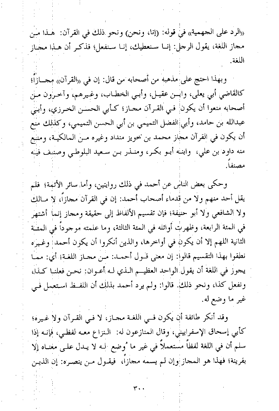 وحكى بعض الناس عن أحمد في ذلك روايتين، وأما سائر الأئمة؛ فلم يقل أحد منهم ولا من قدماء أصحاب أحمد: إن في القرآن مجازاً، لا مالك ولا الشافعي ولا أبو حنيفة؛ فإن تقسيم الألفاظ إلى حقيقة ومجاز إنما أشتهر في المئة الرابعة، وظهرت أوائله في المئة الثالثة، وما علمته موجوداً في المئة الثانية اللهم إلا أن يكون في أواخرها، والذين أنكروا أن يكون أحمد وغيره نطقوا بهذا التقسيم قالوا: إن معنى قول أحمد: من مجاز اللغة؛ أي: مما يجوز في اللغة أن يقول الواحد العظيم الذي له أعوان: نحن فعلنا كذا، ونفعل كذا، ونحو ذلك. قالوا: ولم يرد أحمد بذلك أن اللفظ استعمل في غير ما وضع له.