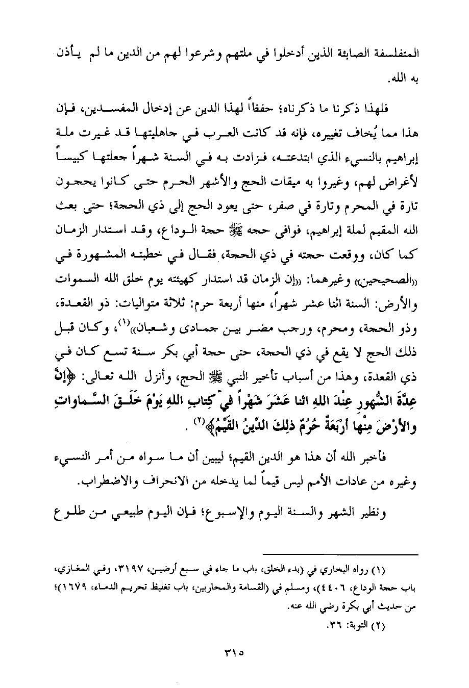 فلهذا ذكرنا ما ذكرناه؛ حفظاً لهذا الدين عن إدخال المفسدين، فإن هذا مما يُخاف تغييره، فإنه قد كانت العرب في جاهليتها قد غيرت ملة إبراهيم بالنسيء الذي ابتدعته، فزادت به في السنة شهراً جعلتها كبيساً لأغراض لهم، وغيروا به ميقات الحج والأشهر الحرم حتى كانوا يحجون تارة في المحرم وتارة في صفر، حتى يعود الحج إلى ذي الحجة؛ حتى بعث الله المقيم لملة إبراهيم، فوافى حجه - صلى الله عليه وسلم - حجة الوداع، وقد استدار الزمان كما كان، ووقعت حجته في ذي الحجة، فقال في خطبته المشهورة في ((الصحيحين)) وغيرهما: ((إن الزمان قد استدار كهيئته يوم خلق الله السموات والأرض: السنة اثنا عشر شهراً، منها أربعة حرم: ثلاثة متواليات: ذو القعدة، وذو الحجة، ومحرم، ورجب مضر بين جمادى وشعبان)) (¬1) ، وكان قبل ذلك الحج لا يقع في ذي الحجة، حتى حجة أبي بكر سنة تسع كان في ذي القعدة، وهذا من أسباب تأخير النبي - صلى الله عليه وسلم - الحج، وأنزل الله تعالى: {إنَّ عِدَّةَ الشُّهورِ عِنْدَ اللهِ اثنا عَشَرَ شَهْراً في كِتابِ اللهِ يَوْمَ خَلَقَ السَّماواتِ والأرْضَ مِنْها أرْبَعَةٌ حُرُمٌ ذلِكَ الدِّينُ القَيِّمُ} (¬2) .