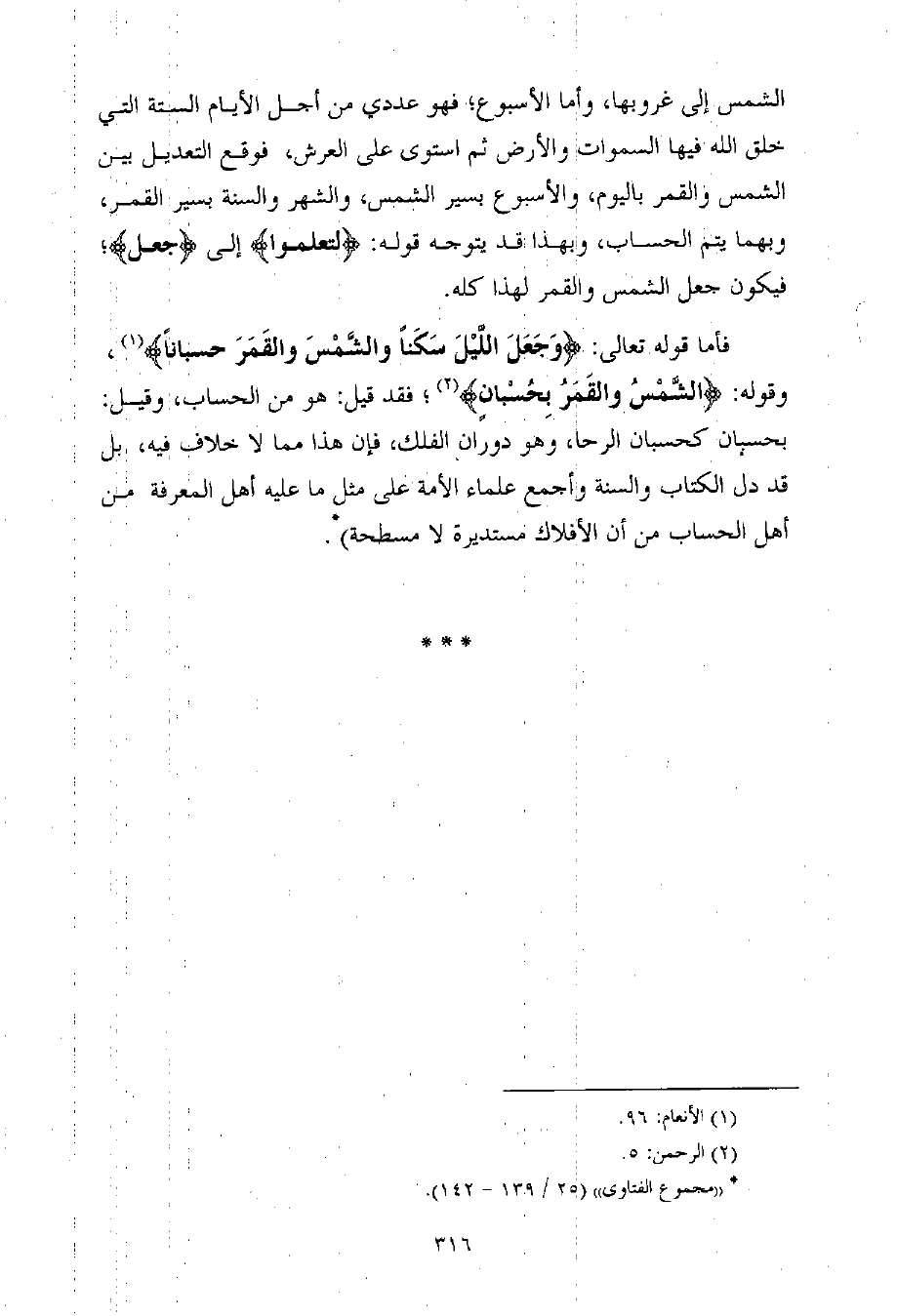 فأما قوله تعالى: {وَجَعَلَ اللَّيْلَ سَكَناً والشَّمْسَ والقَمَرَ حسباناً} (¬1) ، وقوله: {الشَّمْسُ والقَمَرُ بِحُسْبانٍ} (¬2) ؛ فقد قيل: هو من الحساب، وقيل: بحسبان كحسبان الرحا، وهو دوران الفلك، فإن هذا مما لا خلاف فيه، بل قد دل الكتاب والسنة وأجمع علماء الأمة على مثل ما عليه أهل المعرفة من أهل الحساب من أن الأفلاك مستديرة لا مسطحة) (¬3) .