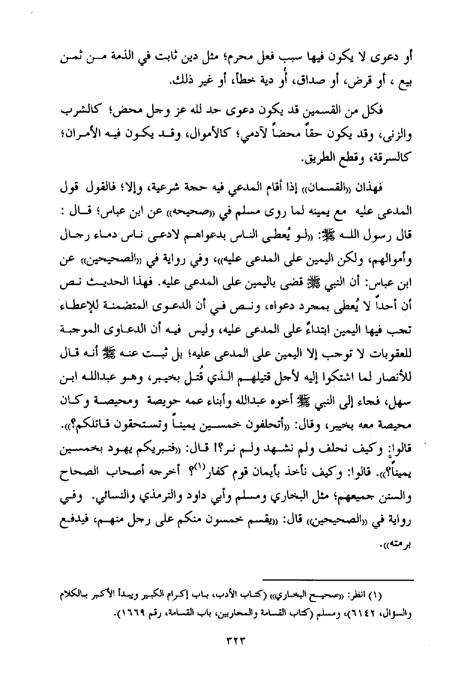 فهذان ((القسمان)) إذا أقام المدعي فيه حجة شرعية، وإلا؛ فالقول قول المدعى عليه مع يمينه لما روى مسلم في ((صحيحه)) عن ابن عباس؛ قال: قال رسول الله - صلى الله عليه وسلم -: ((لو يُعطى الناس بدعواهم لادعى ناس دماء رجال وأموالهم، ولكن اليمين على المدعى عليه)) ، وفي رواية في ((الصحيحين)) عن ابن عباس: أن النبي - صلى الله عليه وسلم - قضى باليمين على المدعى عليه. فهذا الحديث نص أن أحداً لا يُعطى بمجرد دعواه، ونص في أن الدعوى المتضمنة للإعطاء تجب فيها اليمين ابتداءً على المدعى عليه، وليس فيه أن الدعاوى الموجبة للعقوبات لا توجب إلا اليمين على المدعى عليه؛ بل ثبت عنه - صلى الله عليه وسلم - أنه قال للأنصار لما اشتكوا إليه لأجل قتيلهم الذي قُتل بخيبر، وهو عبد الله ابن سهل، فجاء إلى النبي - صلى الله عليه وسلم - أخوه عبد الله وأبناء عمه حويصة ومحيصة وكان محيصة معه بخيبر، وقال: ((أتحلفون خمسين يميناً وتستحقون قاتلكم؟)) . قالوا: وكيف نحلف ولم نشهد ولم نر؟! قال: ((فتبريكم يهود بخمسين يميناً؟)) . قالوا: وكيف نأخذ بأيمان قوم كفار (¬1) ؟ أخرجه أصحاب الصحاح والسنن جميعهم؛ مثل البخاري ومسلم وأبي داود والترمذي والنسائي. وفي رواية في ((الصحيحين)) قال: ((يقسم خمسون منكم على رجل منهم، فيدفع برمته)) .