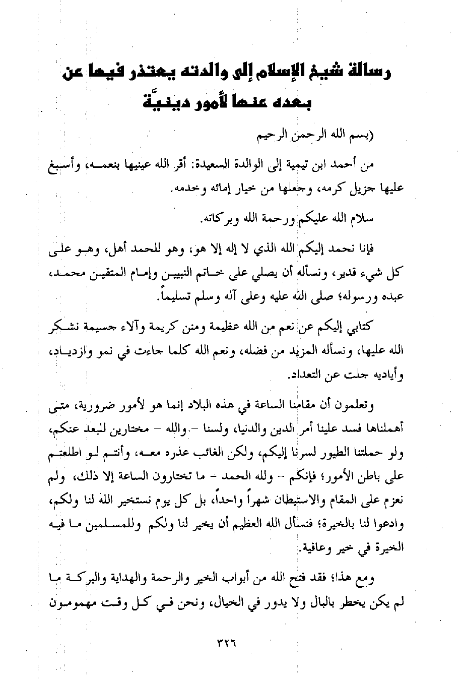 رسالة شيخ الإسلام إلى والدته يعتذر فيها عن بعده