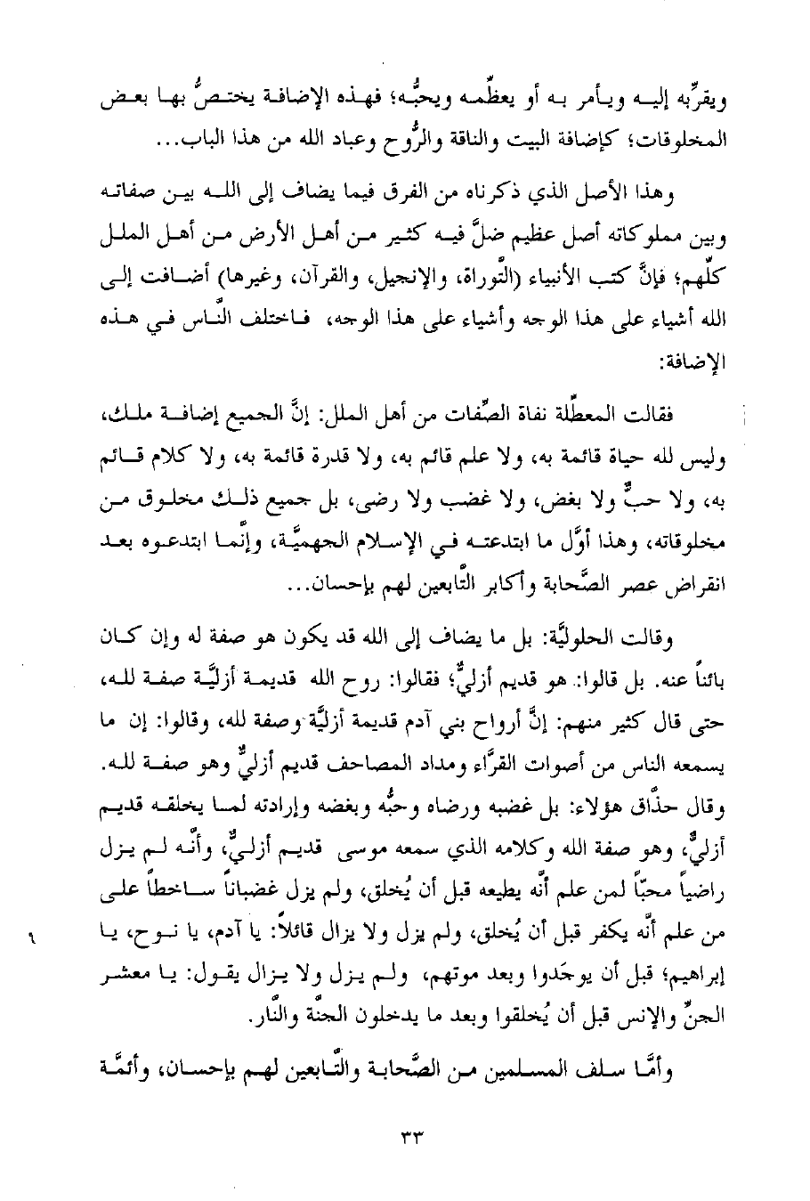 فقالت المعطِّلة نفاة الصِّفات من أهل الملل: إنَّ الجميع إضافة ملك، وليس لله حياة قائمة به، ولا علم قائم به، ولا قدرة قائمة به، ولا كلام قائم به، ولا حبٌّ ولا بغض، ولا غضب ولا رضى، بل جميع ذلك مخلوق من مخلوقاته، وهذا أوَّل ما ابتدعته في الإسلام الجهميَّة، وإنَّما ابتدعوه بعد انقراض عصر الصَّحابة وأكابر التَّابعين لهم بإحسان ...
