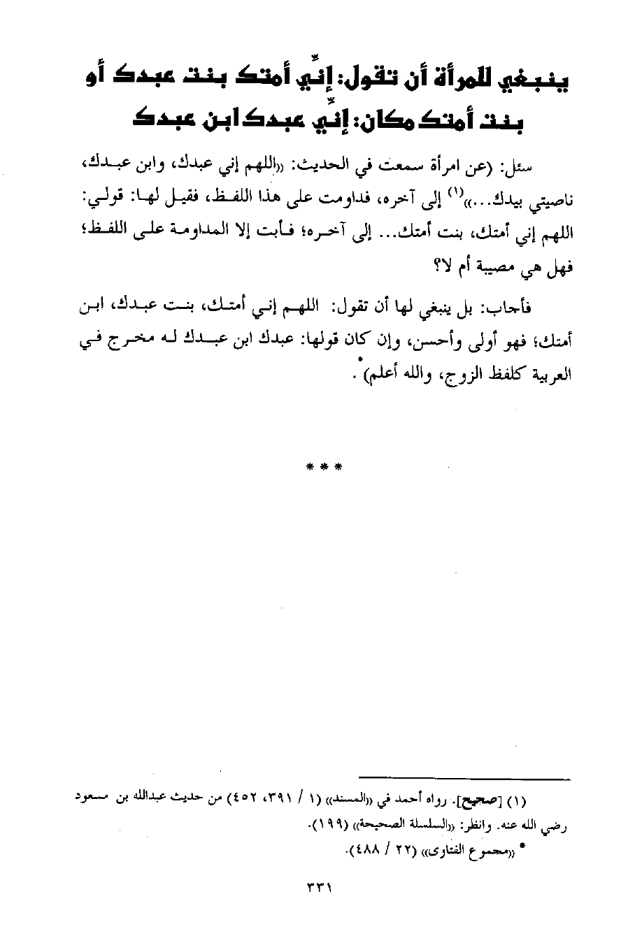 فأجاب: بل ينبغي لها أن تقول: اللهم إني أمتك، بنت عبدك، ابن أمتك؛ فهو أولى وأحسن، وإن كان قولها: عبدك ابن عبدك له مخرج في العربية كلفظ الزوج، والله أعلم) (¬2) .