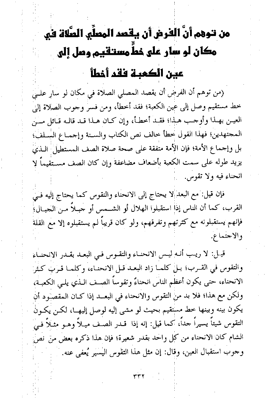 (من توهم أن الفرض أن يقصد المصلي الصلاة في مكان لو سار على خط مستقيم وصل إلى عين الكعبة؛ فقد أخطأ، ومن فسر وجوب الصلاة إلى العين بهذا وأوجب هذا؛ فقد أخطأ، وإن كان هذا قد قاله قائل من المجتهدين؛ فهذا القول خطأ خالف نص الكتاب والسنة وإجماع السلف؛ بل وإجماع الأمة؛ فإن الأمة متفقة على صحة صلاة الصف المستطيل الذي يزيد طوله على سمت الكعبة بأضعاف مضاعفة وإن كان الصف مستقيماً لا انحناء فيه ولا تقوس.
