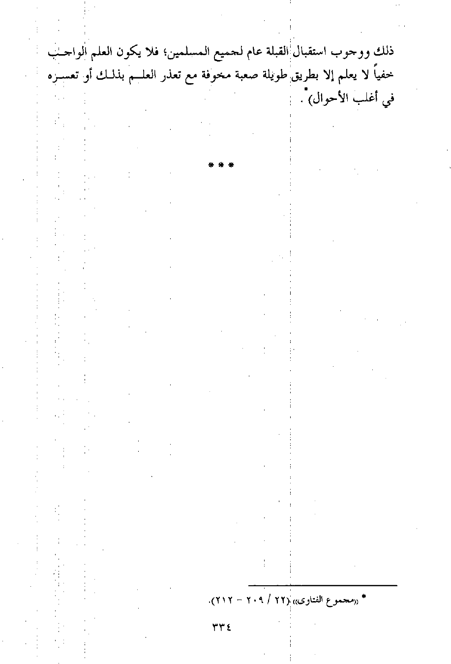 ذلك ووجوب استقبال القبلة عام لجميع المسلمين؛ فلا يكون العلم الواجب خفياً لا يعلم إلا بطريق طويلة صعبة مخوفة مع تعذر العلم بذلك أو تعسره في أغلب الأحوال) (¬1) .