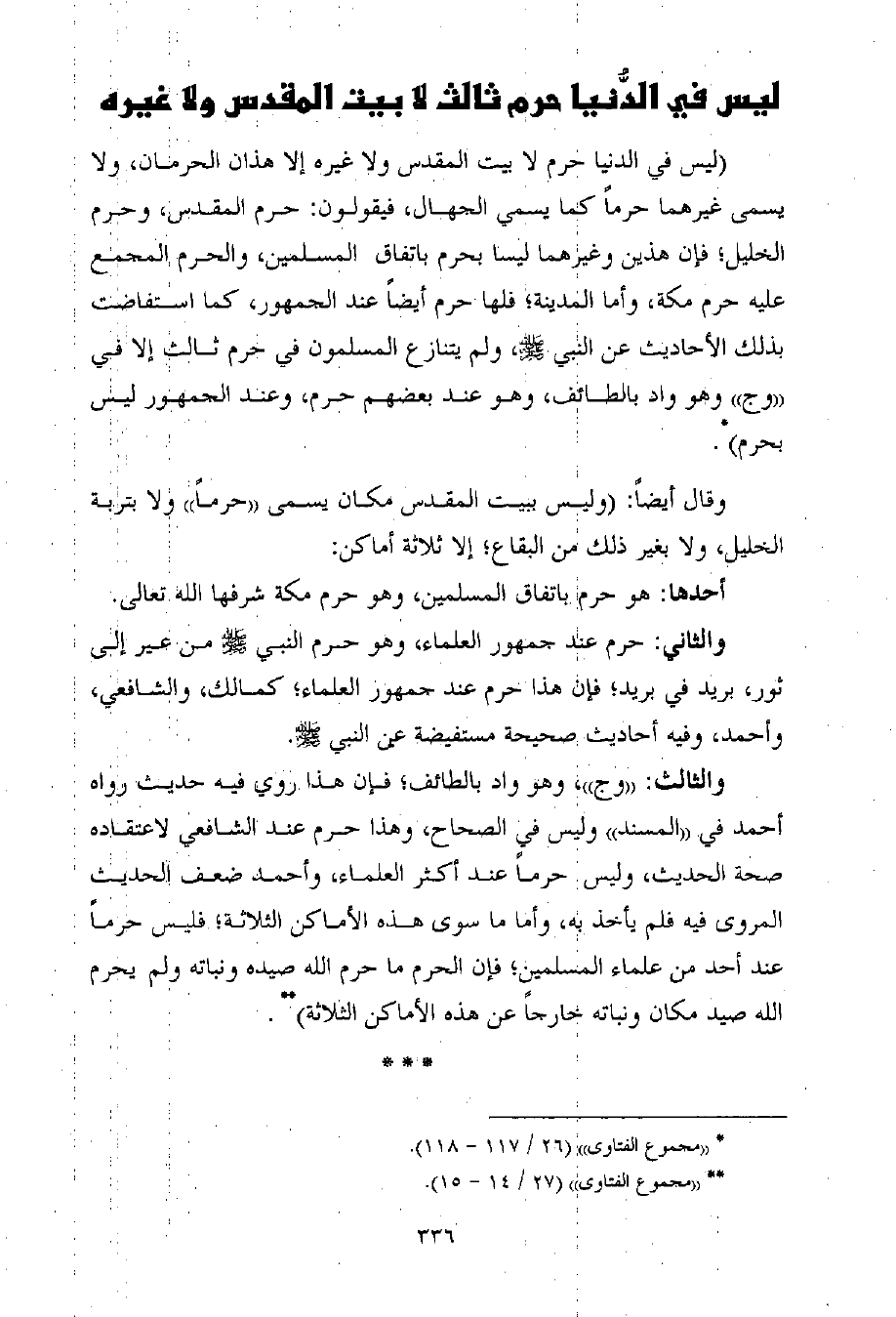 وقال أيضاً: (وليس ببيت المقدس مكان يسمى ((حرماً)) ولا بتربة الخليل، ولا بغير ذلك من البقاع؛ إلا ثلاثة أماكن: