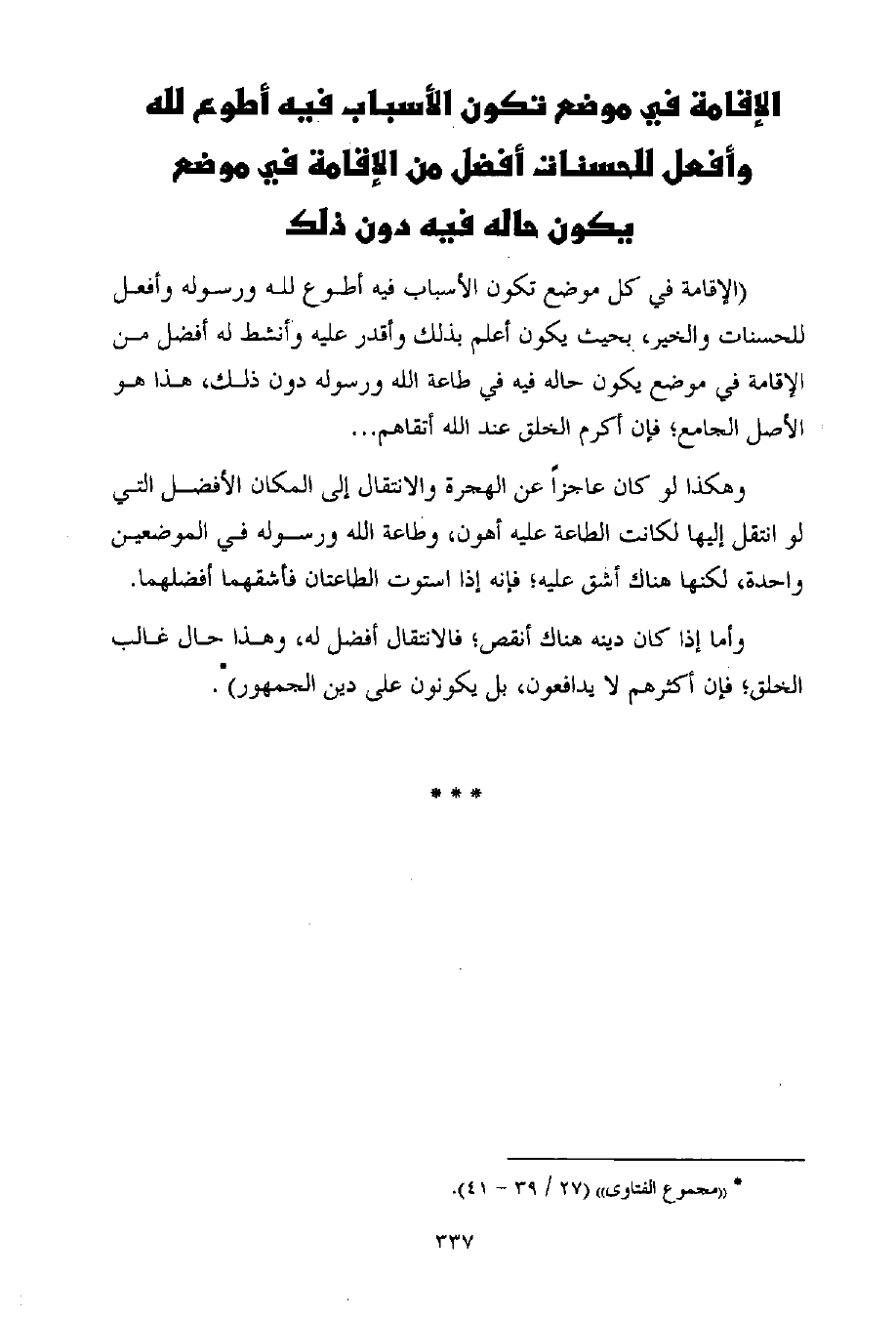 (الإقامة في كل موضع تكون الأسباب فيه أطوع لله ورسوله وأفعل للحسنات والخير، بحيث يكون أعلم بذلك وأقدر عليه وأنشط له أفضل من الإقامة في موضع يكون حاله فيه في طاعة الله ورسوله دون ذلك، هذا هو الأصل الجامع؛ فإن أكرم الخلق عند الله أتقاهم ...