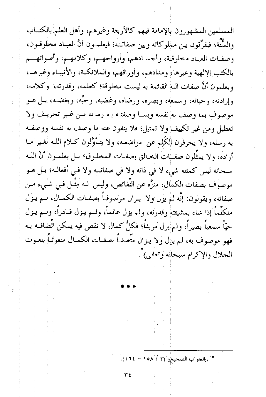 المسلمين المشهورون بالإمامة فيهم كالأربعة وغيرهم، وأهل العلم بالكتاب والسُّنَّة؛ فيفرِّقون بين مملوكاته وبين صفاته؛ فيعلمون أنَّ العباد مخلوقون، وصفات العباد مخلوقة، وأجسادهم، وأرواحهم، وكلامهم، وأصواتهم بالكتب الإلهية وغيرها، ومدادهم، وأوراقهم، والملائكة، والأنبياء وغيرها، ويعلمون أنَّ صفات الله القائمة به ليست مخلوقة؛ كعلمه، وقدرته، وكلامه، وإرادته، وحياته، وسمعه، وبصره، ورضاه، وغضبه، وحبِّه، وبغضه، بل هو موصوف بما وصف به نفسه وبما وصفته به رسله من غير تحريف ولا تعطيل ومن غير تكييف ولا تمثيل؛ فلا ينفون عنه ما وصف به نفسه ووصفه به رسله، ولا يحرفون الكَلِم عن مواضعه، ولا يتأوَّلون كلام الله بغير ما أراده، ولا يمثِّلون صفات الخالق بصفات المخلوق؛ بل يعلمون أنَّ الله سبحانه ليس كمثله شيء لا في ذاته ولا في صفاته ولا في أفعاله؛ بل هو موصوف بصفات الكمال، منزَّه عن النَّقائص، وليس له مِثْل في شيء من صفاته، ويقولون: إنَّه لم يزل ولا يزال موصوفاً بصفات الكمال، لم يزل متكلِّماً إذا شاء بمشيئته وقدرته، ولم يزل عالماً، ولم يزل قادراً، ولم يزل حيّاً سمعياً بصيراً، ولم يزل مريداً؛ فكلُّ كمال لا نقص فيه يمكن اتِّصافه به فهو موصوف به، لم يزل ولا يزال متَّصفاً بصفات الكمال منعوتاً بنعوت الجلال والإكرام سبحانه وتعالى) (¬1) .