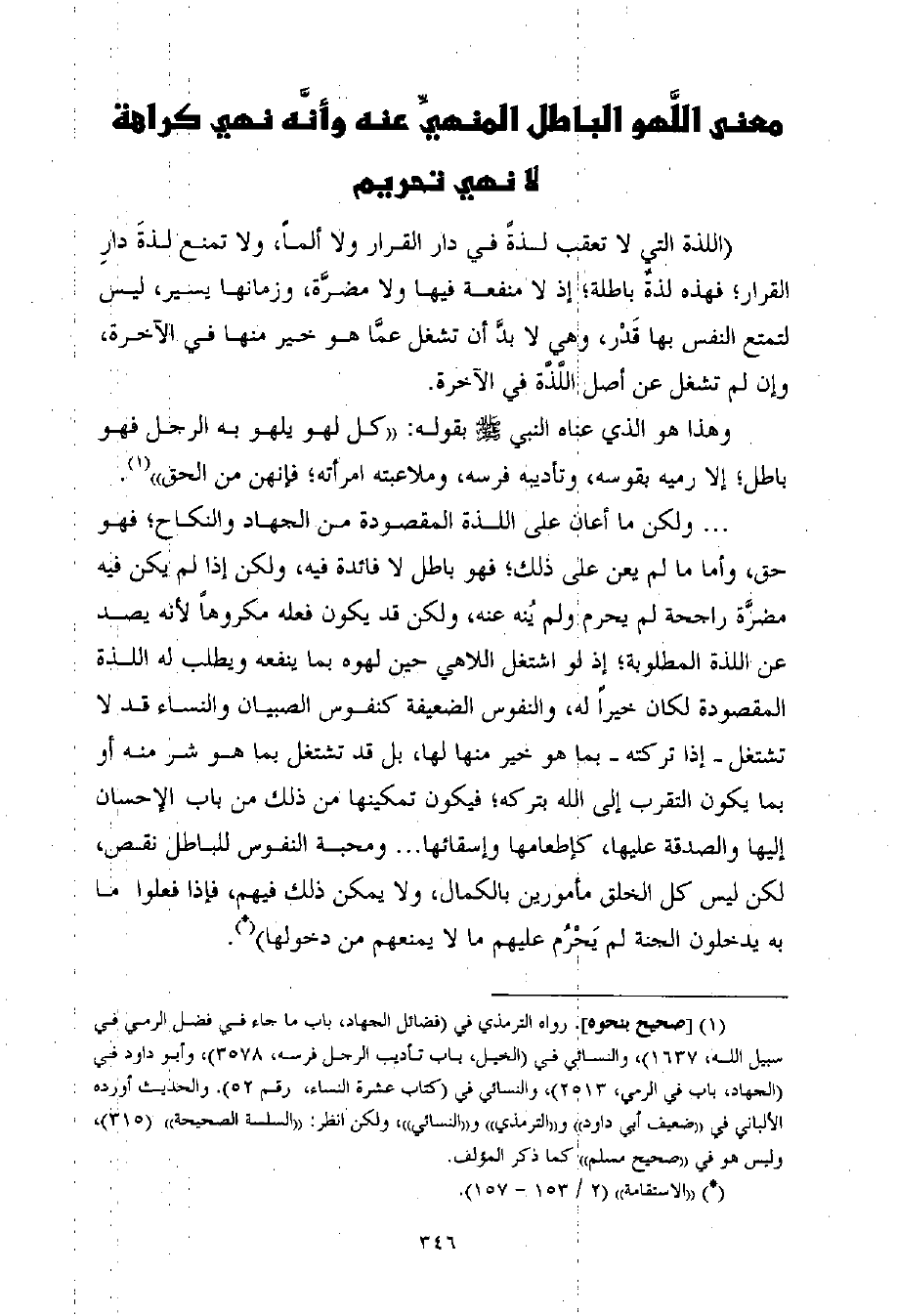 ... ولكن ما أعان على اللذة المقصودة من الجهاد والنكاح؛ فهو حق، وأما ما لم يعن على ذلك؛ فهو باطل لا فائدة فيه، ولكن إذا لم يكن فيه مضرَّة راجحة لم يحرم ولم يُنه عنه، ولكن قد يكون فعله مكروهاً لأنه يصد عن اللذة المطلوبة؛ إذ لو اشتغل اللاهي حين لهوه بما ينفعه ويطلب له اللذة المقصودة لكان خيراً له، والنفوس الضعيفة كنفوس الصبيان والنساء قد لا تشتغل ـ إذا تركته ـ بما هو خير منها لها، بل قد تشتغل بما هو شر منه أو بما يكون التقرب إلى الله بتركه؛ فيكون تمكينها من ذلك من باب الإحسان إليها والصدقة عليها، كإطعامها وإسقائها ... ومحبة النفوس للباطل نقص، لكن ليس كل الخلق مأمورين بالكمال، ولا يمكن ذلك فيهم، فإذا فعلوا ما به يدخلون الجنة لم يَحْرُم عليهم ما لا يمنعهم من دخولها) (¬2) .