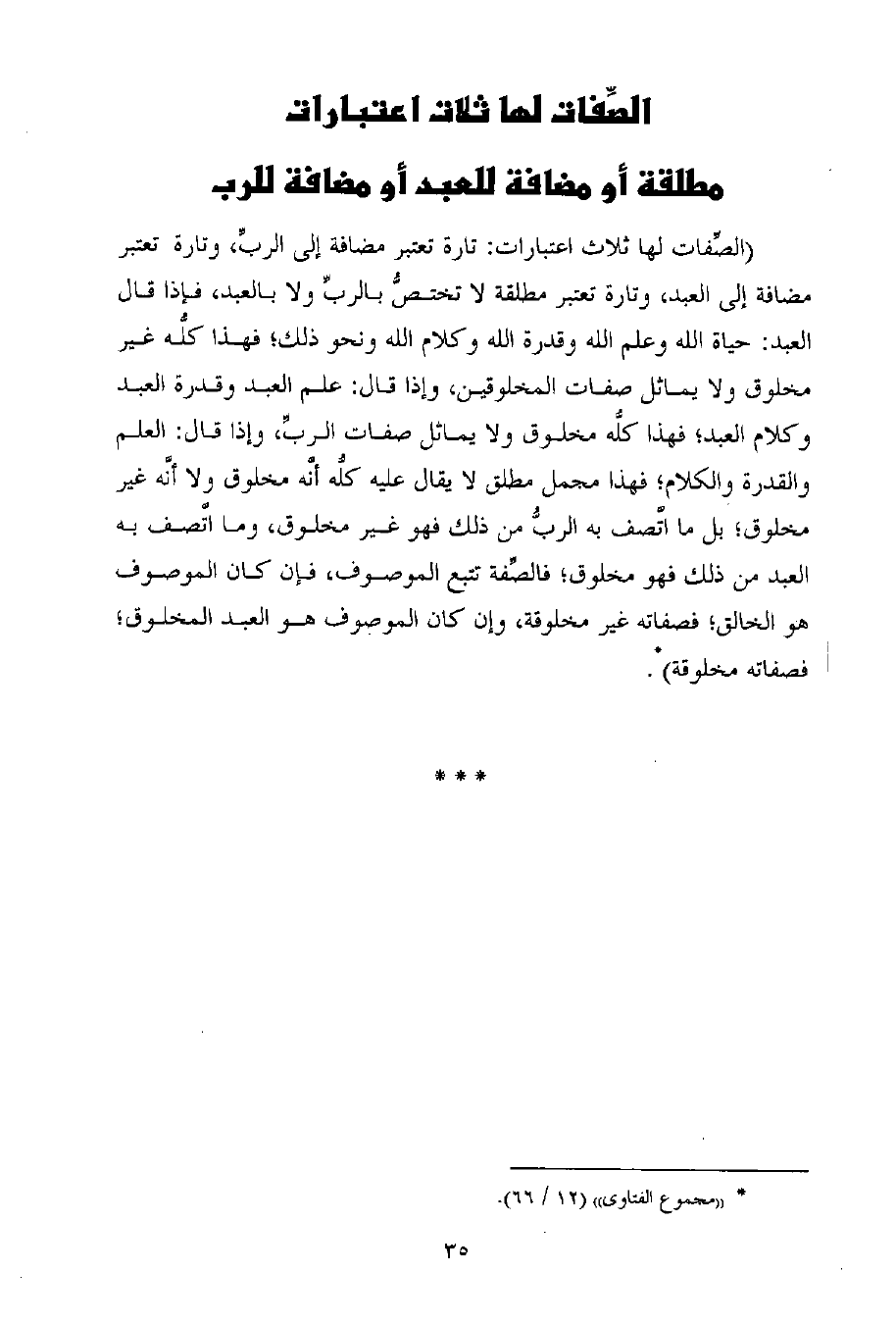 (الصِّفات لها ثلاث اعتبارات: تارة تعتبر مضافة إلى الربِّ، وتارة تعتبر مضافة إلى العبد، وتارة تعتبر مطلقة لا تختصُّ بالربِّ ولا بالعبد، فإذا قال العبد: حياة الله وعلم الله وقدرة الله وكلام الله ونحو ذلك؛ فهذا كلُّه غير مخلوق ولا يماثل صفات المخلوقين، وإذا قال: علم العبد وقدرة العبد وكلام العبد؛ فهذا كلُّه مخلوق ولا يماثل صفات الربِّ، وإذا قال: العلم والقدرة والكلام؛ فهذا مجمل مطلق لا يقال عليه كلُّه أنَّه مخلوق ولا أنَّه غير مخلوق؛ بل ما اتَّصف به الربُّ من ذلك فهو غير مخلوق، وما اتَّصف به العبد من ذلك فهو مخلوق؛ فالصِّفة تتبع الموصوف، فإن كان الموصوف هو الخالق؛ فصفاته غير مخلوقة، وإن كان الموصوف هو العبد المخلوق؛ فصفاته مخلوقة) (¬1) .