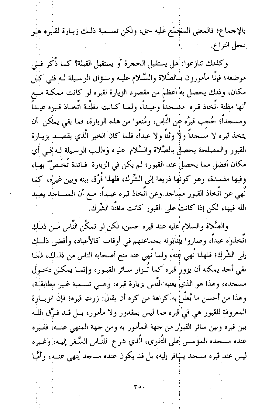 وكذلك تنازعوا: هل يستقبل الحجرة أو يستقبل القبلة؟ كما ذُكر في موضعه؛ فإنَّا مأمورون بالصَّلاة والسَّلام عليه وسؤال الوسيلة له في كل مكان، وذلك يحصل به أعظم من مقصود الزيارة لقبره لو كانت ممكنة مع أنها مظنة اتِّخاذ قبره مسجداً وعيداً، ولما كانت مظنَّة اتِّخاذ قبره عيداً ومسجداً؛ حُجِب قبرُه عن النَّاس، ومُنعوا من هذه الزيارة، فما بقي يمكن أن يتخذ قبره لا مسجداً ولا وثناً ولا عيداً، فلما كان الخير الَّذي يقصد بزيارة القبور والمصلحة يحصل بالصَّلاة والسَّلام عليه وطلب الوسيلة له في أي مكان أفضل مما يحصل عند القبور؛ لم يكن في الزيارة فائدة تُخَصُّ بها، وفيها مفسدة، وهو كونها ذريعة إلى الشِّرك، فلهذا فُرِّق بينه وبين غيره، كما نُهي عن اتِّخاذ القبور مساجد وعن اتِّخاذ قبره عيداً، مع أن المساجد يعبد الله فيها، لكن إذا كانت على القبور كانت مظنَّة الشِّرك.