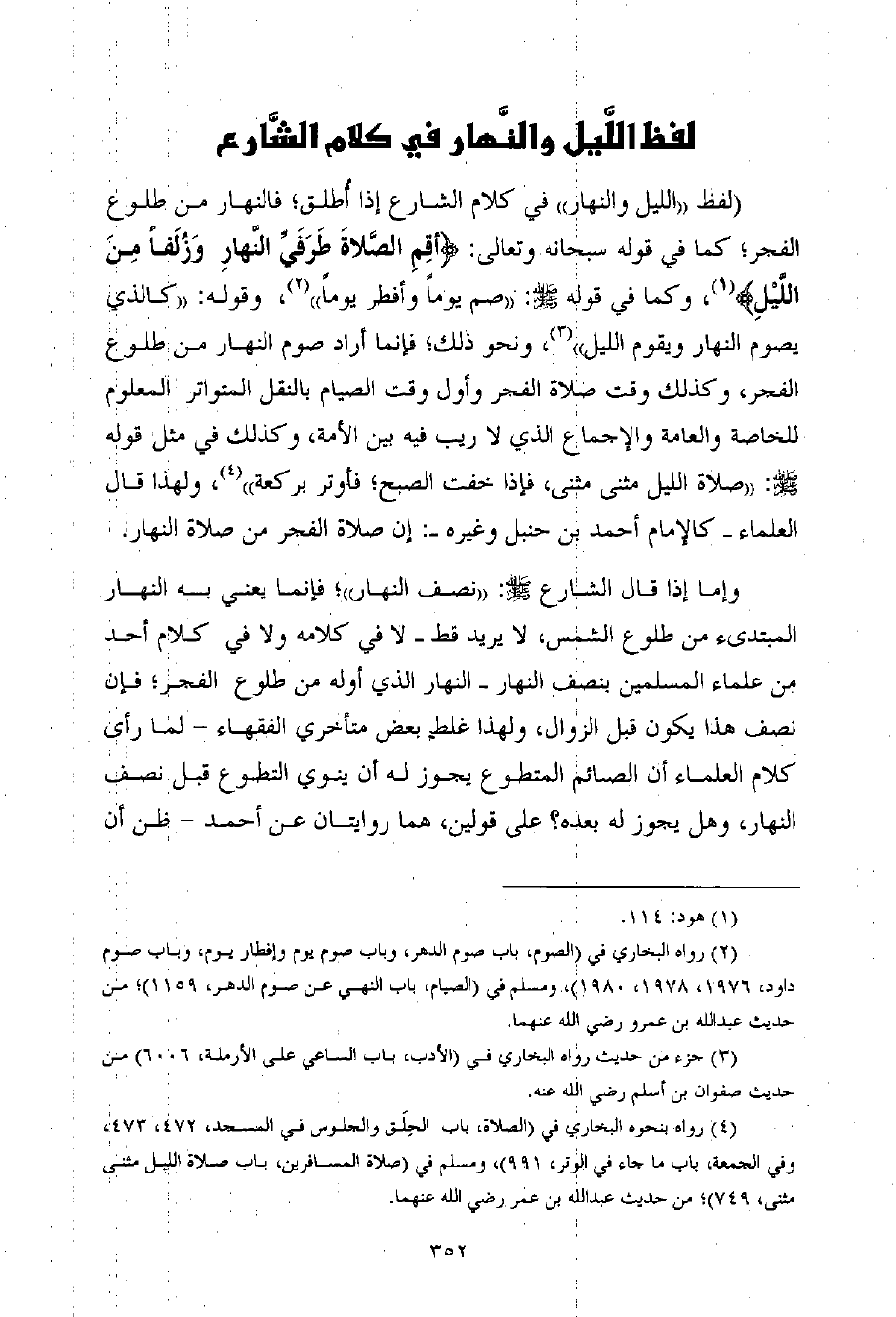 (لفظ ((الليل والنهار)) في كلام الشارع إذا أُطلق؛ فالنهار من طلوع الفجر؛ كما في قوله سبحانه وتعالى: {أقِمِ الصَّلاةَ طَرَفَيِّ النَّهارِ وَزُلَفاً مِنَ اللَّيْلِ} (¬1) ، وكما في قوله - صلى الله عليه وسلم -: ((صم يوماً وأفطر يوماً)) (¬2) ، وقوله: ((كالذي يصوم النهار ويقوم الليل)) (¬3) ، ونحو ذلك؛ فإنما أراد صوم النهار من طلوع الفجر، وكذلك وقت صلاة الفجر وأول وقت الصيام بالنقل المتواتر المعلوم للخاصة والعامة والإجماع الذي لا ريب فيه بين الأمة، وكذلك في مثل قوله - صلى الله عليه وسلم -: ((صلاة الليل مثنى مثنى، فإذا خفت الصبح؛ فأوتر بركعة)) (¬4) ، ولهذا قال العلماء ـ كالإمام أحمد بن حنبل وغيره ـ: إن صلاة الفجر من صلاة النهار.