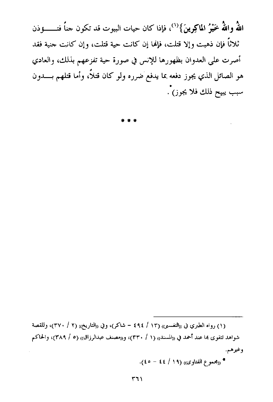 اللهُ واللهُ خَيْرُ الماكِرينَ} (¬1) ، فإذا كان حيات البيوت قد تكون جناً فتؤذن ثلاثاً فإن ذهبت وإلا قتلت، فإنها إن كانت حية قتلت، وإن كانت جنية فقد أصرت على العدوان بظهورها للإنس في صورة حية تفزعهم بذلك، والعادي هو الصائل الذي يجوز دفعه بما يدفع ضرره ولو كان قتلاً، وأما قتلهم بدون سبب يبيح ذلك فلا يجوز) (¬2) .