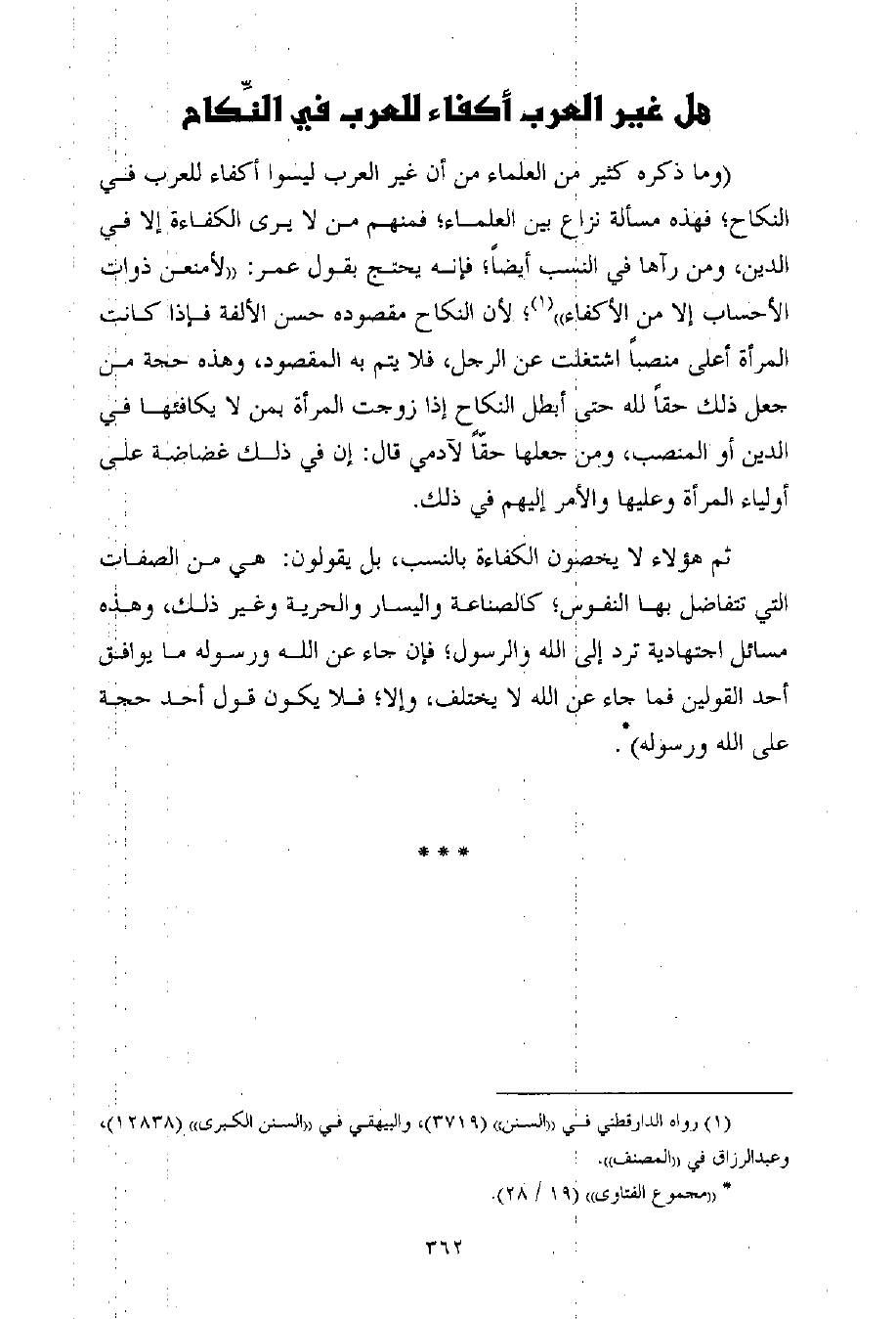 (وما ذكره كثير من العلماء من أن غير العرب ليسوا أكفاء للعرب في النكاح؛ فهذه مسألة نزاع بين العلماء؛ فمنهم من لا يرى الكفاءة إلا في الدين، ومن رآها في النسب أيضاً؛ فإنه يحتج بقول عمر: ((لأمنعن ذوات الأحساب إلا من الأكفاء)) (¬1) ؛ لأن النكاح مقصوده حسن الألفة فإذا كانت المرأة أعلى منصباً اشتغلت عن الرجل، فلا يتم به المقصود، وهذه حجة من جعل ذلك حقاً لله حتى أبطل النكاح إذا زوجت المرأة بمن لا يكافئها في الدين أو المنصب، ومن جعلها حقّاً لآدمي قال: إن في ذلك غضاضة على أولياء المرأة وعليها والأمر إليهم في ذلك.