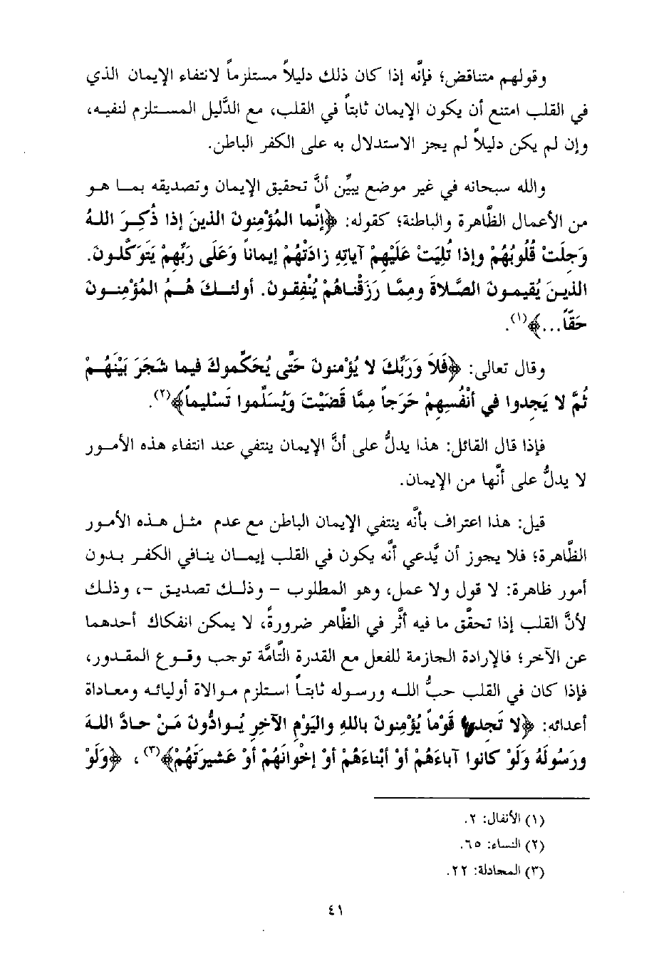 قيل: هذا اعتراف بأنَّه ينتفي الإيمان الباطن مع عدم مثل هذه الأمور الظَّاهرة؛ فلا يجوز أن يَّدعي أنَّه يكون في القلب إيمان ينافي الكفر بدون أمور ظاهرة: لا قول ولا عمل، وهو المطلوب - وذلك تصديق -، وذلك لأنَّ القلب إذا تحقَّق ما فيه أثَّر في الظَّاهر ضرورةً، لا يمكن انفكاك أحدهما عن الآخر؛ فالإرادة الجازمة للفعل مع القدرة التَّامَّة توجب وقوع المقدور، فإذا كان في القلب حبُّ الله ورسوله ثابتاً استلزم موالاة أوليائه ومعاداة أعدائه: {لا تَجِدوا قَوْماً يُؤْمِنونَ باللهِ واليَوْمِ الآخِرِ يُوادُّونَ مَنْ حادَّ اللهَ ورَسُولَهُ وَلَوْ كانوا آباءَهُمْ أوْ أبْناءَهُمْ أوْ إخْوانَهُمْ أوْ عَشيرَتَهُمْ} (¬3) ، {وَلَوْ