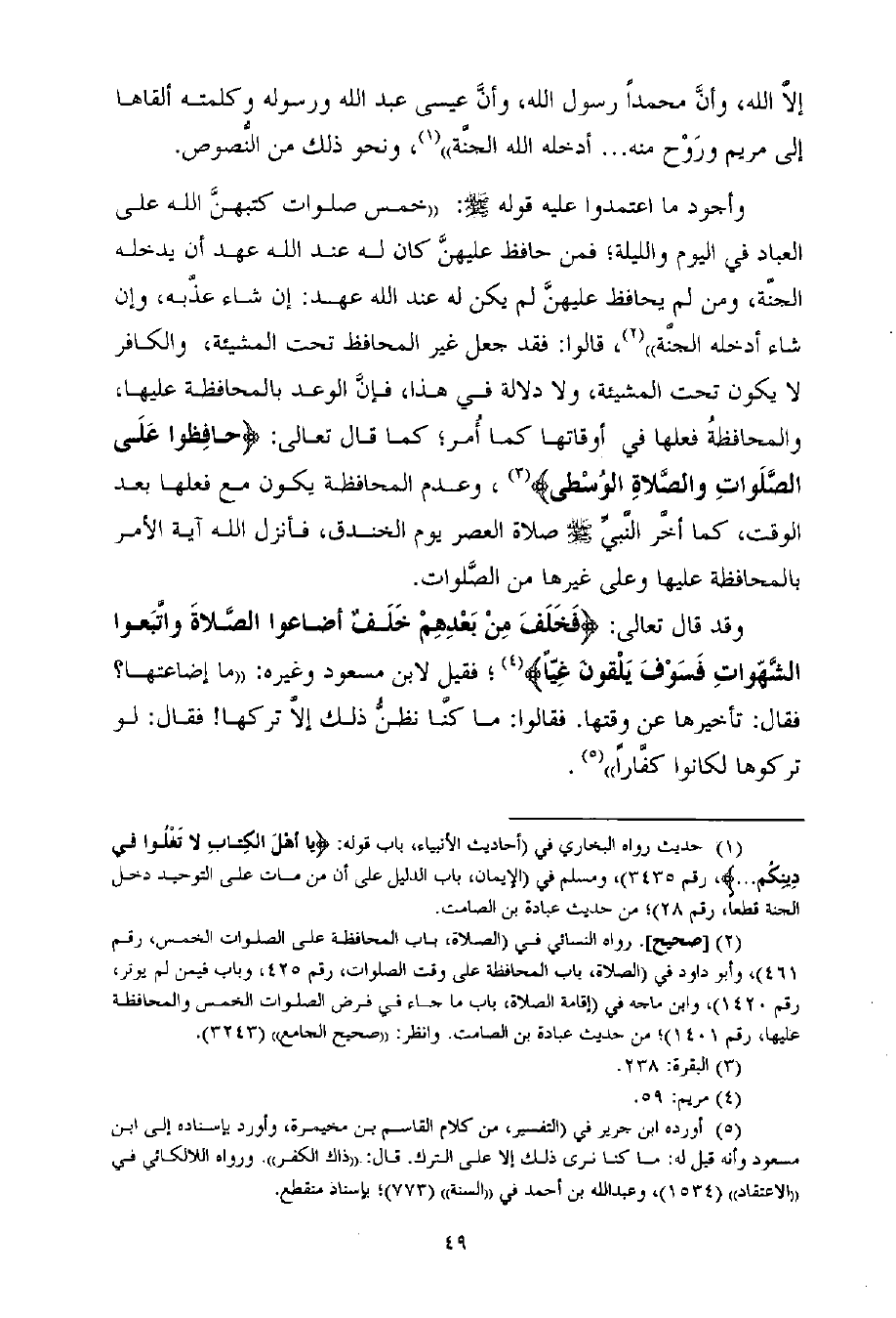 وأجود ما اعتمدوا عليه قوله - صلى الله عليه وسلم -: ((خمس صلوات كتبهنَّ الله على العباد في اليوم والليلة؛ فمن حافظ عليهنَّ كان له عند الله عهد أن يدخله الجنَّة، ومن لم يحافظ عليهنَّ لم يكن له عند الله عهد: إن شاء عذَّبه، وإن شاء أدخله الجنَّة)) (¬2) ، قالوا: فقد جعل غير المحافظ تحت المشيئة، والكافر لا يكون تحت المشيئة، ولا دلالة في هذا، فإنَّ الوعد بالمحافظة عليها، والمحافظةُ فعلها في أوقاتها كما أُمر؛ كما قال تعالى: {حافِظوا عَلَى الصَّلَواتِ والصَّلاةِ الوُسْطى} (¬3) ، وعدم المحافظة يكون مع فعلها بعد الوقت، كما أخَّر النَّبيِّ - صلى الله عليه وسلم - صلاة العصر يوم الخندق، فأنزل الله آية الأمر بالمحافظة عليها وعلى غيرها من الصَّلوات.