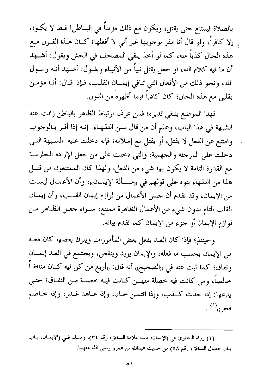 فهذا الموضع ينبغي تدبره؛ فمن عرف ارتباط الظاهر بالباطن زالت عنه الشبهة في هذا الباب، وعلم أن من قال من الفقهاء: إنه إذا أقر بالوجوب وامتنع عن الفعل لا يقتل، أو يقتل مع إسلامه؛ فإنه دخلت عليه الشبهة التي دخلت على المرجئة والجهمية، والتي دخلت على من جعل الإرادة الجازمة مع القدرة التامة لا يكون بها شيء من الفعل، ولهذا كان الممتنعون من قتل هذا من الفقهاء بنوه على قولهم في ((مسألة الإيمان)) ، وأن الأعمال ليست من الإيمان، وقد تقدم أن جنس الأعمال من لوازم إيمان القلب، وأن إيمان القلب التام بدون شيء من الأعمال الظاهرة ممتنع، سواء جعل الظاهر من لوازم الإيمان أو جزء من الإيمان كما تقدم بيانه.