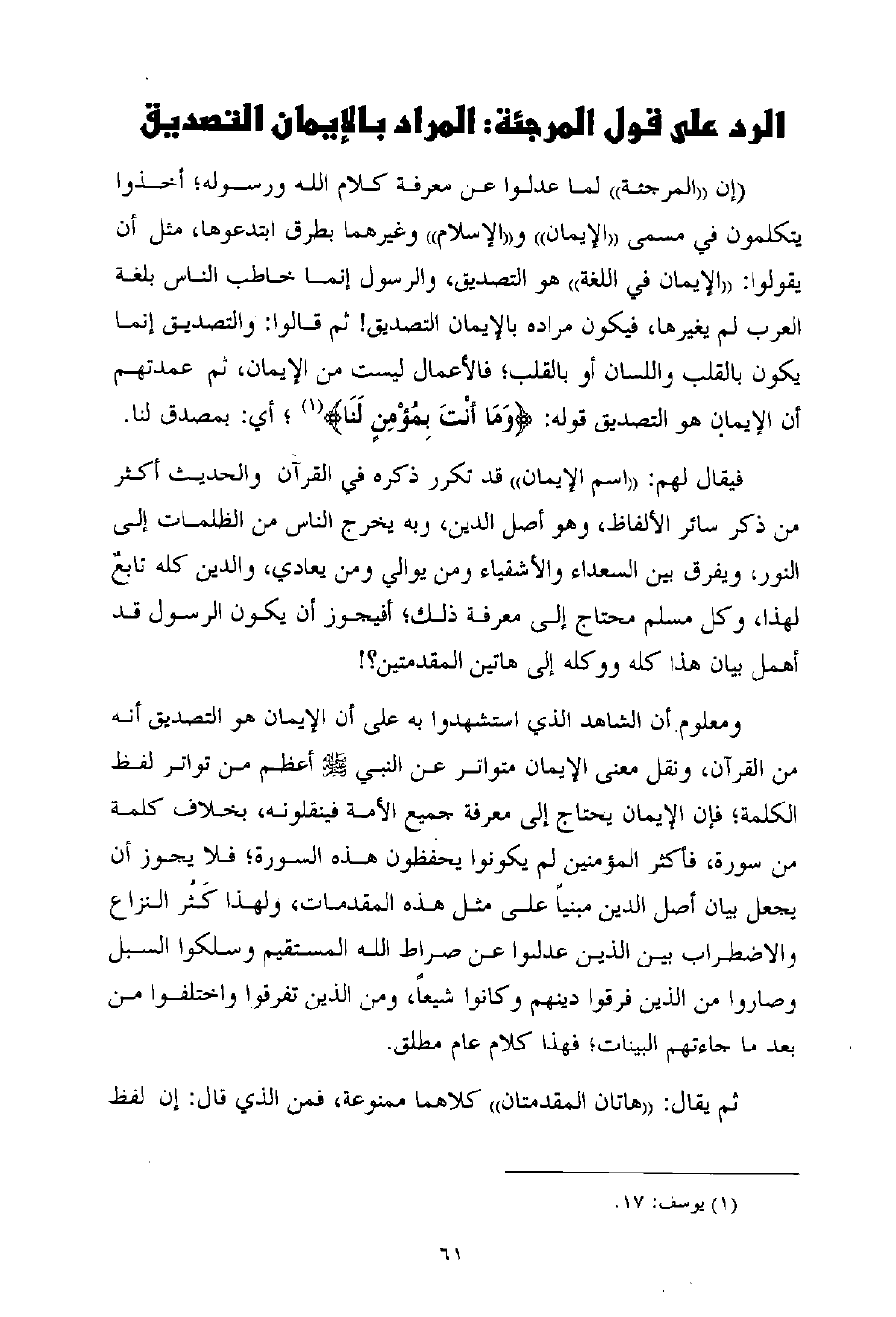 ومعلوم أن الشاهد الذي استشهدوا به على أن الإيمان هو التصديق أنه من القرآن، ونقل معنى الإيمان متواتر عن النبي - صلى الله عليه وسلم - أعظم من تواتر لفظ الكلمة؛ فإن الإيمان يحتاج إلى معرفة جميع الأمة فينقلونه، بخلاف كلمة من سورة، فأكثر المؤمنين لم يكونوا يحفظون هذه السورة؛ فلا يجوز أن يجعل بيان أصل الدين مبنياً على مثل هذه المقدمات، ولهذا كَثُر النزاع والاضطراب بين الذين عدلوا عن صراط الله المستقيم وسلكوا السبل وصاروا من الذين فرقوا دينهم وكانوا شيعاً، ومن الذين تفرقوا واختلفوا من بعد ما جاءتهم البينات؛ فهذا كلام عام مطلق.
