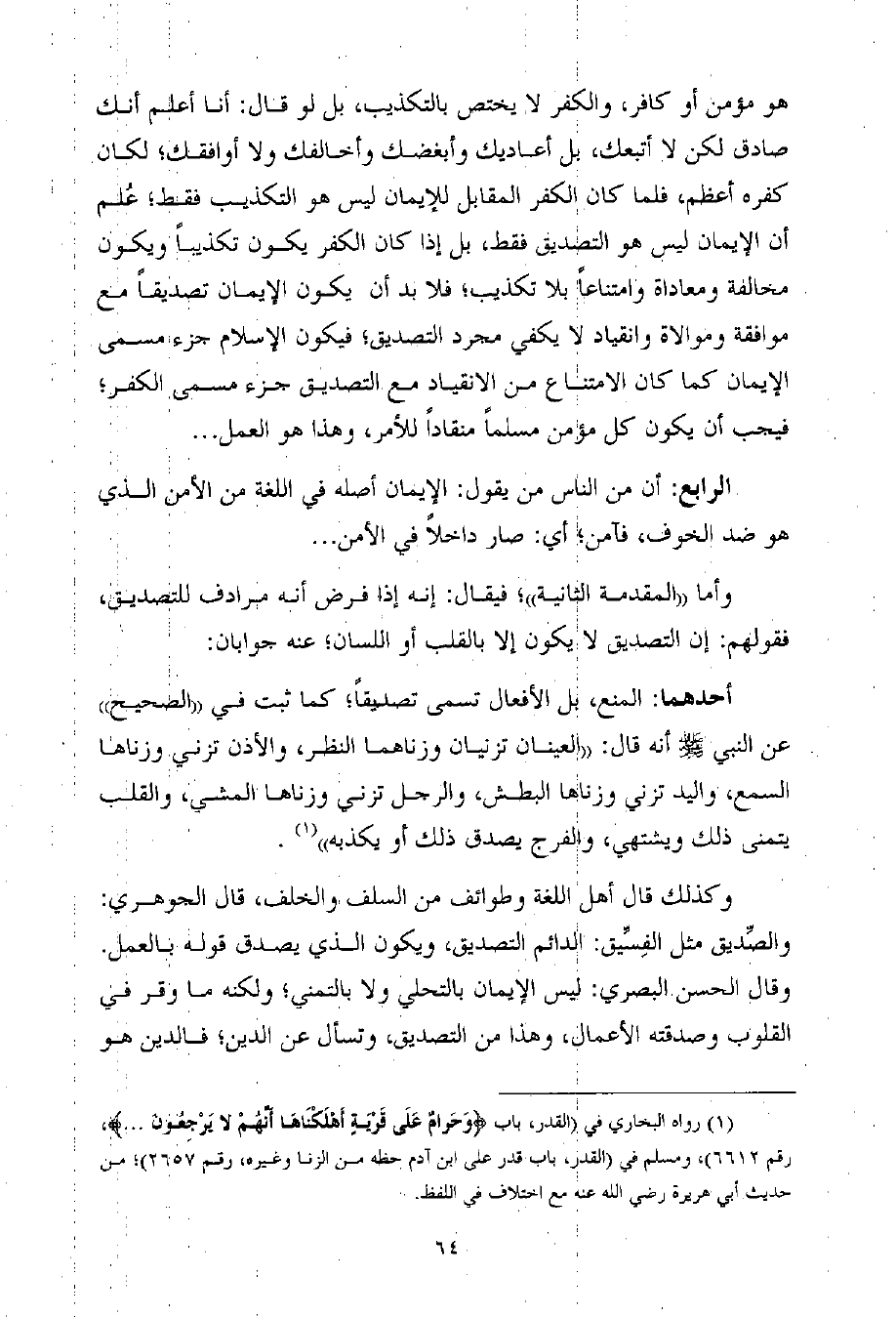 (¬1) رواه البخاري في (القدر، باب {وَحَرامٌ عَلَى قَرْيَةٍ أَهْلَكْنَاهَا أَنَّهُمْ لا يَرْجِعُونَ ... } ، رقم 6612) ، ومسلم في (القدر، باب قدر على ابن آدم حظه من الزنا وغيره، رقم 2657) ؛ من حديث أبي هريرة رضي الله عنه مع اختلاف في اللفظ.