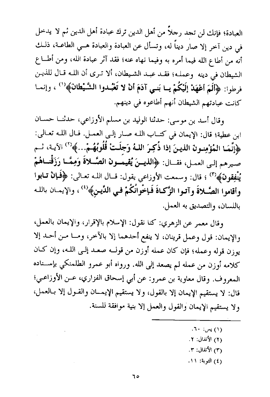 وقال أسد بن موسى: حدثنا الوليد بن مسلم الأوزاعي، حدثنا حسان ابن عطية؛ قال: الإيمان في كتاب الله صار إلى العمل. قال الله تعالى: {إنَّمَا المُؤْمِنونَ الذينَ إذا ذُكِرَ اللهُ وَجِلَتْ قُلُوبُهُمْ ... } (¬2) الآية، ثم صيرهم إلى العمل، فقال: {الذينَ يُقيمونَ الصَّلاةَ وَمِمَّا رَزَقْناهُمْ يُنْفِقونَ} (¬3) ؛ قال: وسمعت الأوزاعي يقول: قال الله تعالى: {فَإنْ تابوا وأقاموا الصَّلاةَ وآتوا الزَّكاةَ فَإخْوانُكُمْ في الدِّينِ} (¬4) ، والإيمان بالله باللسان، والتصديق به العمل.