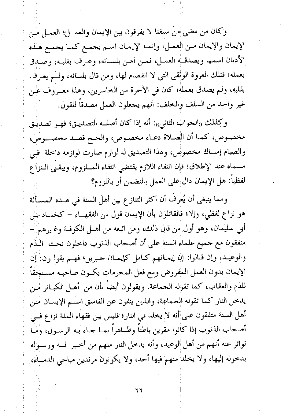 وكان من مضى من سلفنا لا يفرقون بين الإيمان والعمل؛ العمل من الإيمان والإيمان من العمل، وإنما الإيمان اسم يجمع كما يجمع هذه الأديان اسمها ويصدقه العمل، فمن آمن بلسانه، وعرف بقلبه، وصدق بعمله؛ فتلك العروة الوثقى التي لا انفصام لها، ومن قال بلسانه، ولم يعرف بقلبه، ولم يصدق بعمله؛ كان في الآخرة من الخاسرين، وهذا معروف عن غير واحد من السلف والخلف: أنهم يجعلون العمل مصدقاً للقول.