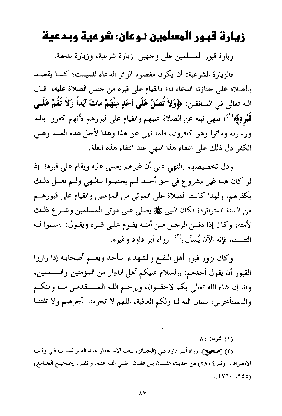 زيارة قبور المسلمين على وجهين: زيارة شرعية، وزيارة بدعية.