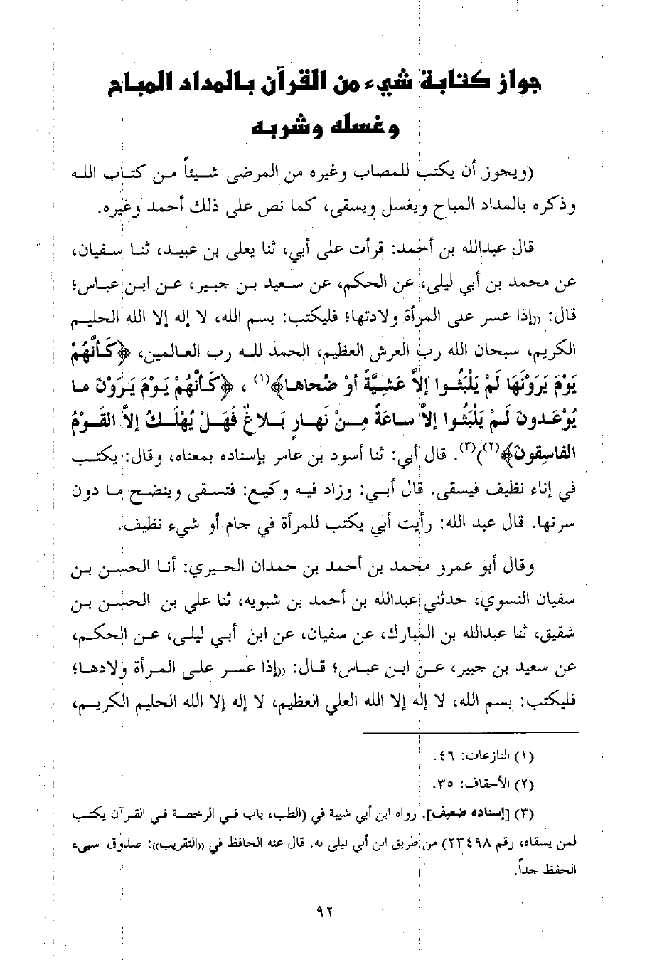 (ويجوز أن يكتب للمصاب وغيره من المرضى شيئاً من كتاب الله وذكره بالمداد المباح ويغسل ويسقى، كما نص على ذلك أحمد وغيره.