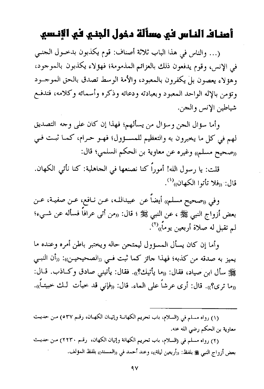 (¬1) رواه مسلم في (السلام، باب تحريم الكهانة وإتيان الكهان، رقم 537) من حديث معاوية بن الحكم رضي الله عنه.