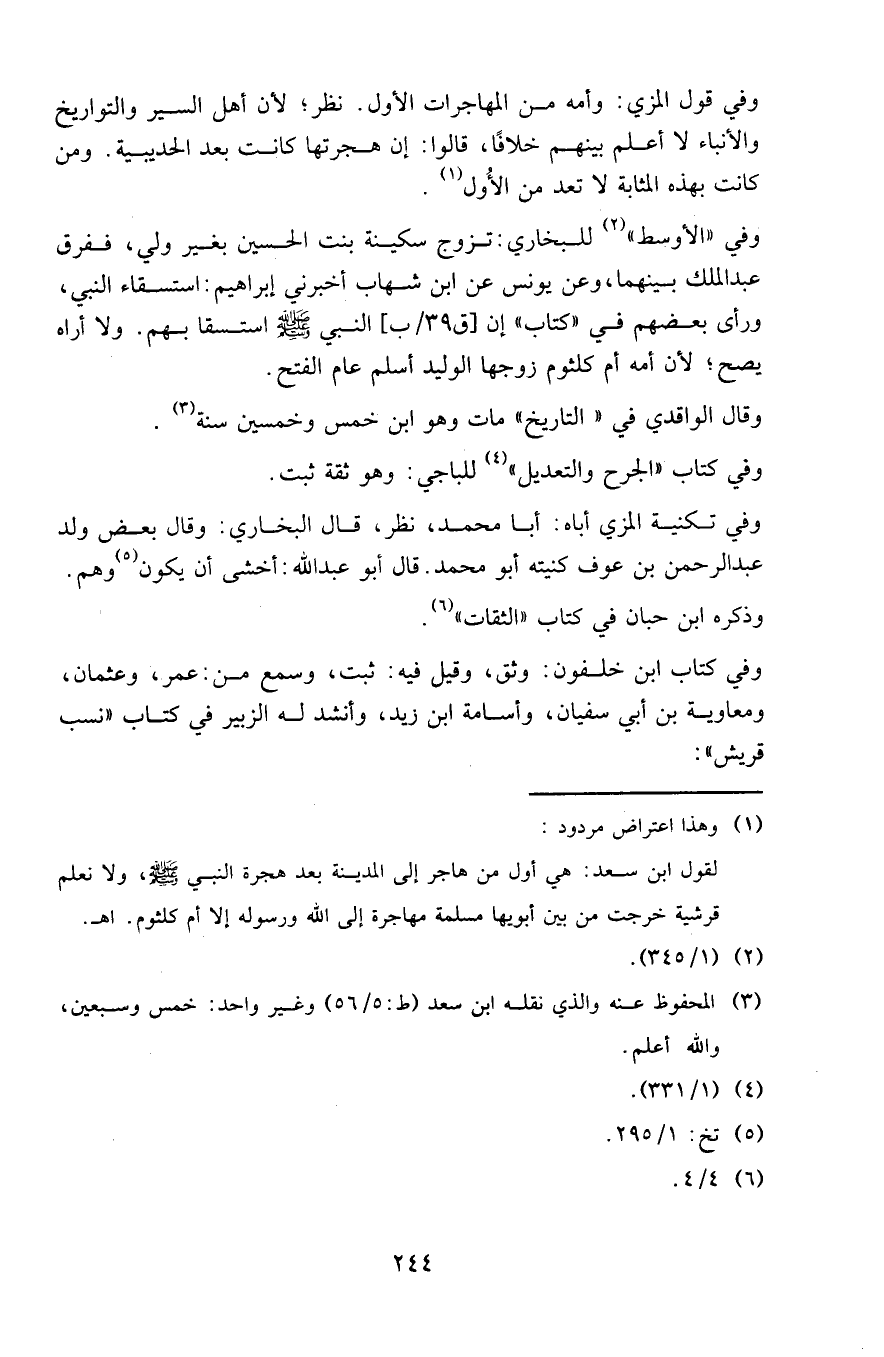 وفي قول المزي : وأمه من المهاجرات الأول . نظر ، لأن أهل السير والتواريخ