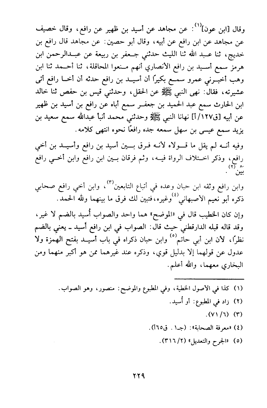 وقال ( ابن عون ) ( 1 ) : عن مجاهد عن أسيد بن ظهير عن رافع ، وقال خصيف