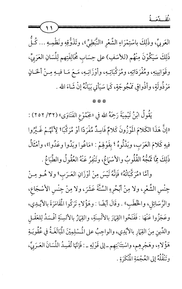 العَربيِّ، وذَلِكَ باسْتِمْرَاءِ الشِّعْرِ «النَّبَطِيِّ»، وتَذَوُّقِهِ ونَظْمِهِ ... كُلُّ ذَلِكَ سَيَكُوْنَ مِنْهُم (للأسَفِ) على حِسَابِ مُخَالِفَتِهم لِلِّسَانِ العَرَبِيِّ، وقَوَانِينِهِ، ومُفْرَدَاتِهِ، ومُرَكَّبَاتِهِ، وأوْزَانِهِ، مَعَ مَا فيهِ مِنْ ألحَانٍ مَرْذُولَةٍ، وأذْواقٍ مَمْجُوجَةٍ، كَما سَيَأتي بَيَانُهُ إنْ شَاءَ الله.