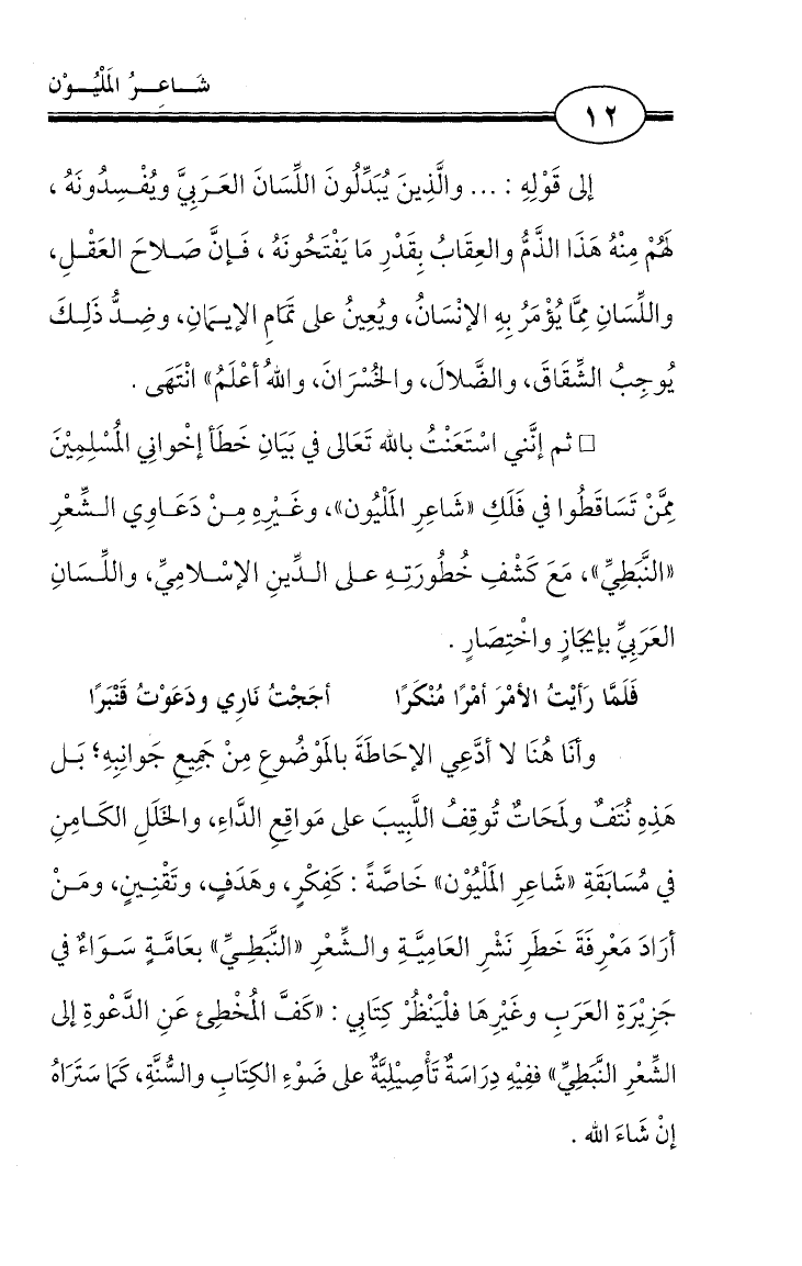 - ثم إنَّني اسْتَعَنْتُ بالله تَعَالى في بَيَانِ خَطَأ إخْوانِي المُسْلِمِيْنَ مِمَّنْ تَسَاقَطُوا في فَلَكِ «شَاعِرِ المَلْيُون»، وغَيْرِهِ مِنْ دَعَاوِي الشِّعْرِ «النَّبَطِيِّ»، مَعَ كَشْفِ خُطُورَتِهِ على الدِّينِ الإسْلامِيِّ، واللِّسَانِ العَرَبِيِّ بإيجَازٍ واخْتِصَارٍ.