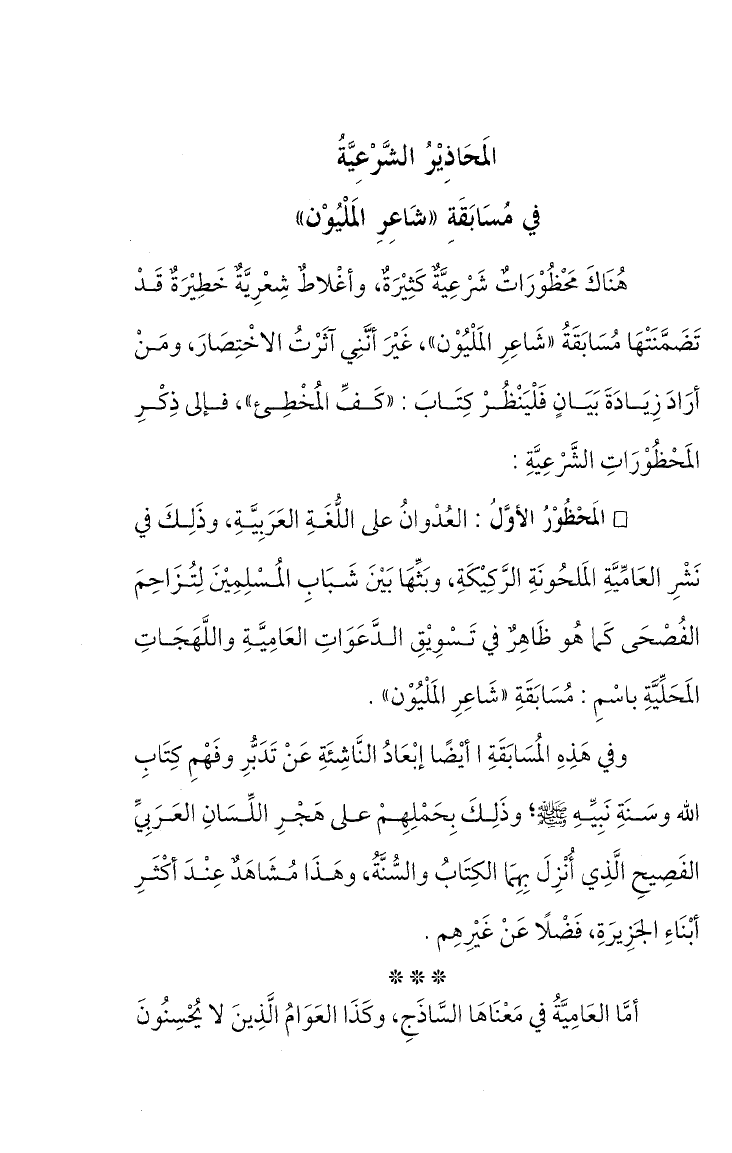 هُنَاكَ مَحْظُوْرَاتٌ شَرْعِيَّةٌ كَثِيْرَةٌ، وأغْلاطٌ شِعْرِيَّةٌ خَطِيْرَةٌ قَدْ تَضَمَّنَتْهَا مُسَابَقَةُ «شَاعِرِ المَلْيُوْن»، غَيْرَ أنَّنِي آثَرْتُ الاخْتِصَارَ، ومَنْ أرَادَ زِيَادَةَ بَيَانٍ فَلْيَنْظُرْ كِتَابَ: «كَفِّ المُخْطِئ»، فإلى ذِكْرِ المَحْظُوْرَاتِ الشَّرْعِيَّةِ: