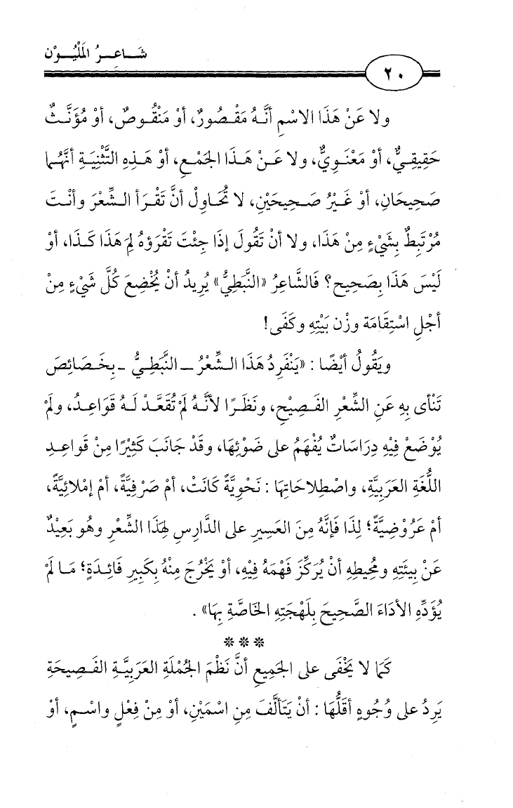 ولا أنْ تَقُولَ إذَا جِئْتَ تَقْرَؤهُ لِمَ هَذَا كَذَا، أوْ لَيْسَ هَذَا بِصَحِيح؟ فَالشَّاعِرُ «النَّبَطِيُّ» يُرِيدُ أنْ يُخْضِعَ كُلَّ شَيْءٍ مِنْ أجْلِ اسْتِقَامَة وزْن بَيْتِهِ وكَفَى!