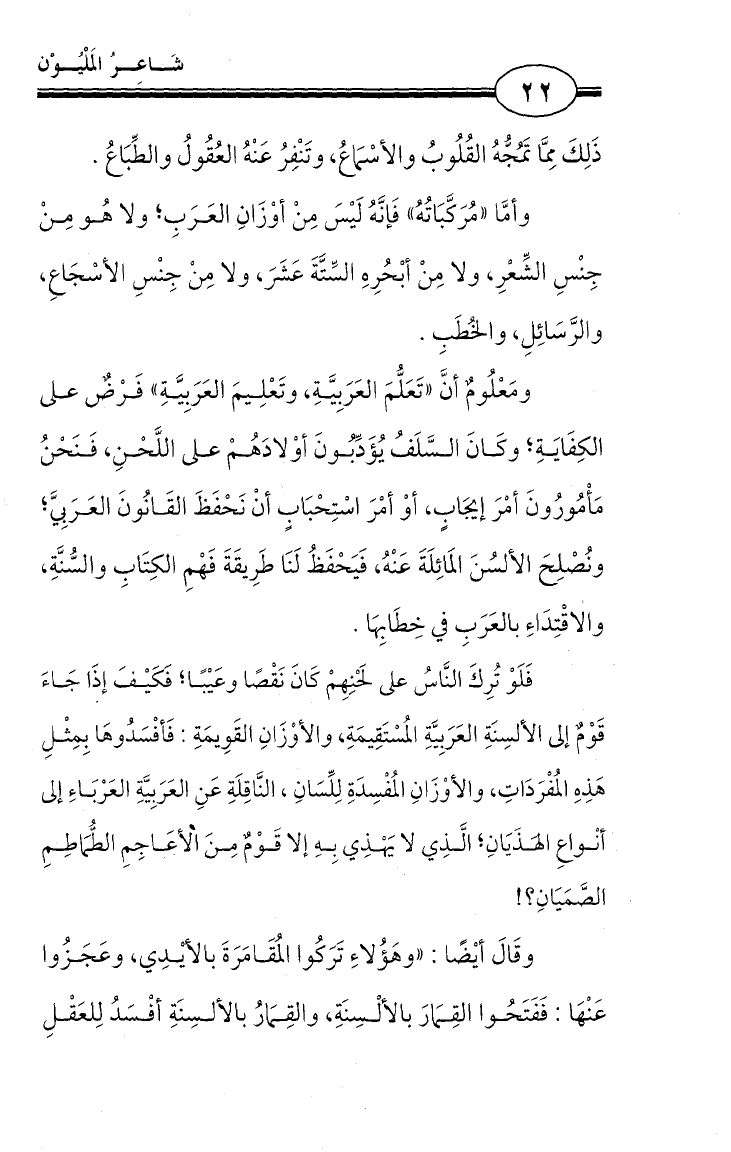 فَلَوْ تُرِكَ النَّاسُ على لَحْنِهِمْ كَانَ نَقْصًا وعَيْبًا; فَكَيْفَ إذَا جَاءَ قَوْمٌ إلى الألسِنَةِ العَرَبِيَّةِ المُسْتَقِيمَةِ، والأوْزَانِ القَوِيمَةِ: فَأفْسَدُوهَا بِمِثْلِ هَذِهِ المُفْرَدَاتِ، والأوْزَانِ المُفْسِدَةِ لِلِّسَانِ، النَّاقِلَةِ عَنِ العَرَبِيَّةِ العَرْبَاءِ إلى أنْواعِ الهَذَيَانِ; الَّذِي لا يَهْذِي بِهِ إلا قَوْمٌ مِنَ الأعَاجِمِ الطُّمَاطِمِ الصَّمَيَانِ؟!