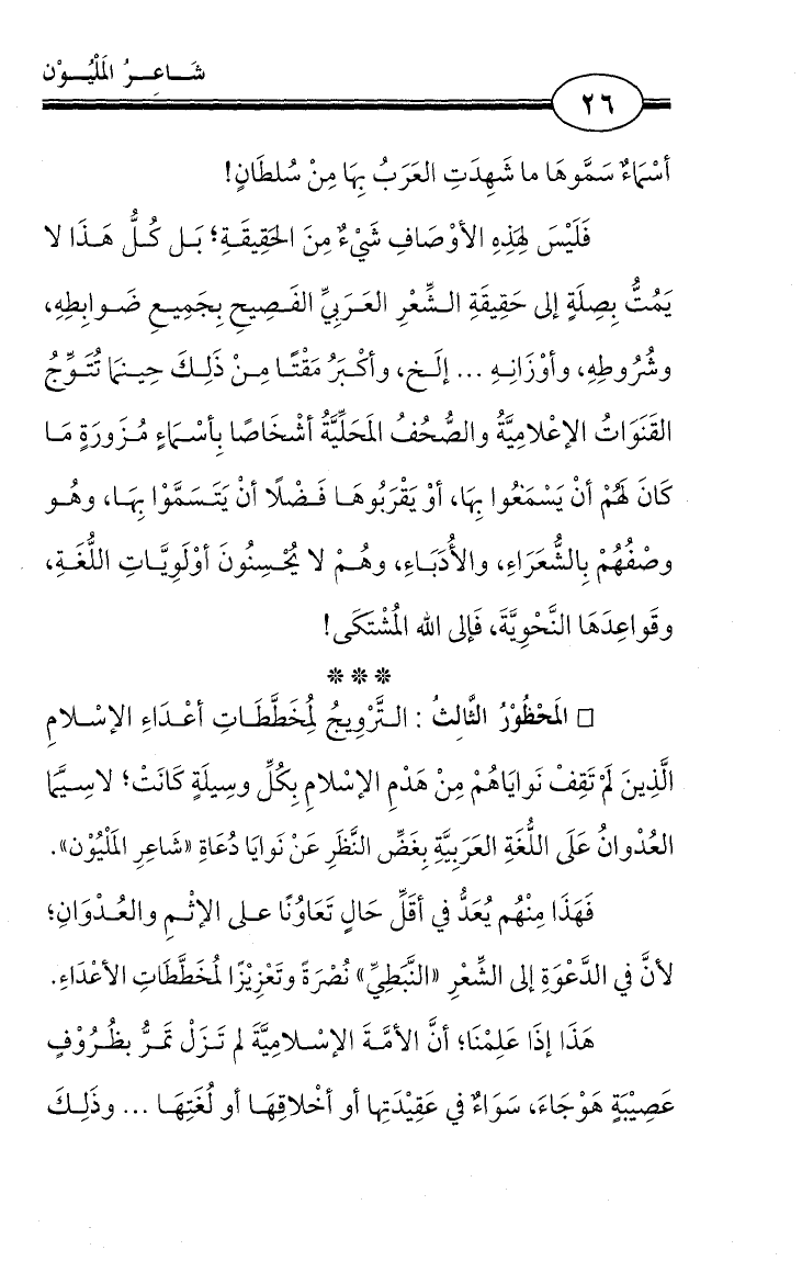 - المَحْظُوْرُ الثَّالِثُ: التَّرْوِيجُ لِمُخَطَّطَاتِ أعْدَاءِ الإسْلامِ الَّذِينَ لَمْ تَقِفْ نَوايَاهُمْ مِنْ هَدْمِ الإسْلامِ بِكُلِّ وسِيلَةٍ كَانَتْ; لاسِيَّمَا العُدْوانُ عَلَى اللُّغَةِ العَرَبِيَّةِ; بِغَضِّ النَّظَرِ عَنْ نَوايَا دُعَاةِ «شَاعِرِ المَلْيُوْن».