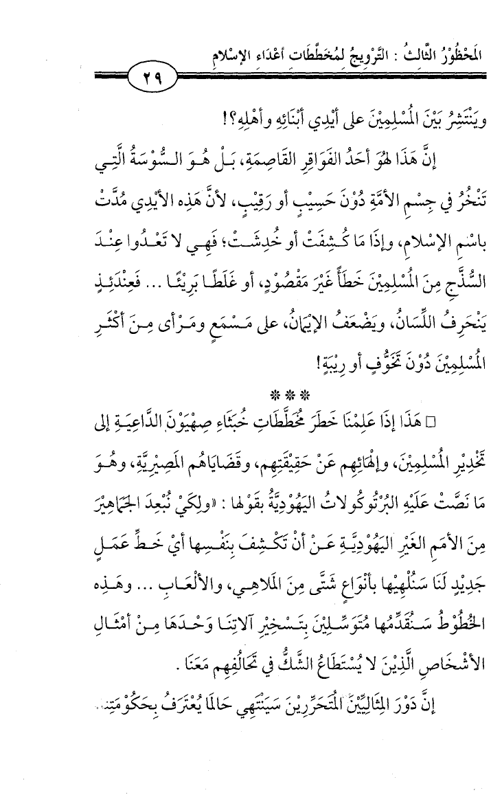 - هَذَا إذَا عَلِمْنَا خَطَرَ مُخَطَّطَاتِ خُبَثَاءِ صِهْيَوْنَ الدَّاعِيَةِ إلى تَخْدِيْرِ المُسْلِمِيْنَ، وإلْهَائِهِم عَنْ حَقِيْقَتِهِم، وقَضَايَاهُم المَصِيْرِيَّةِ، وهُوَ مَا نَصَّتْ عَلَيْهِ البُرْتُوكُولاتُ اليَهُوْدِيَّةُ بقَوْلها: «ولِكَيْ نُبْعِدَ الجَمَاهِيْرَ مِنَ الأمَمِ الغَيْرِ اليَهُوْدِيَّةِ عَنْ أنْ تَكْشِفَ بِنَفْسِها أيْ خَطِّ عَمَلٍ جَدِيْدٍ لَنَا سَنُلْهِيْها بأنْوَاعٍ شَتَّى مِنَ المَلاهِي، والألْعَابِ ... وهَذِه الخُطُوْطُ سَنُقَدِّمُها مُتَوَسِّلِيْنَ بِتَسْخِيْرِ آلاتِنَا وَحْدَهَا مِنْ أمْثَالِ الأشْخَاصِ الَّذِيْنَ لا يُسْتَطَاعُ الشَّكُّ في تَحَالُفِهِم مَعَنَا.