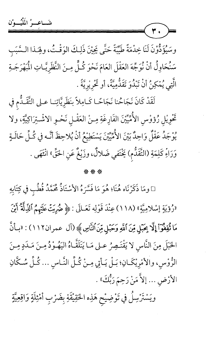 - ومَا ذَكَرْنَاه هُنَا؛ هُوَ مَا فَسَّرَهُ الأسْتَاذُ مُحَمَّدُ قُطُبٍ في كِتَابِهِ «رُؤيَةٍ إسْلامِيَّةٍ» (118) عِنْدَ قَوْلِه تَعَالَى: (ضُرِبَتْ عَلَيْهِمُ الذِّلَّةُ أَيْنَ مَا ثُقِفُوا إِلاَّ بِحَبْل مِنَ الله وَحَبْلٍ مِنَ النَّاسِ) (آل عمران 112)،: «بأنَّ الحَبَلَ مِنَ النَّاسِ لا يَقْتَصِرُ على مَا يَتَلَقَّاهُ اليَهُوْدُ مِنَ مَدَدٍ مِنَ الرُّوْسِ، والأمْرِيْكَانِ؛ بَلْ يَأتِي مِنْ كُلِّ النَّاسِ ... كُلِّ سُكَّانِ الأرْضِ ... إلاَّ مَنْ رَحِمَ رَبُّكَ».