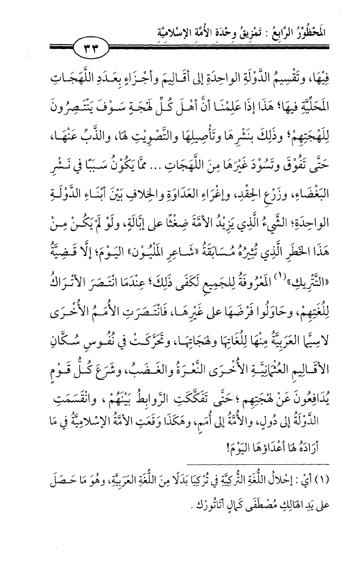 (¬1) أيْ: إحْلالُ اللُّغَةِ التُّركِيَّةِ في تُرْكِيَا بَدَلاً مِنَ اللُّغَةِ العَرَبِيَّةِ، وهُوَ مَا حَصَلَ على يَدِ الهَالِكِ مُصْطَفَى كَمالٍ أتَاتُورْك ..