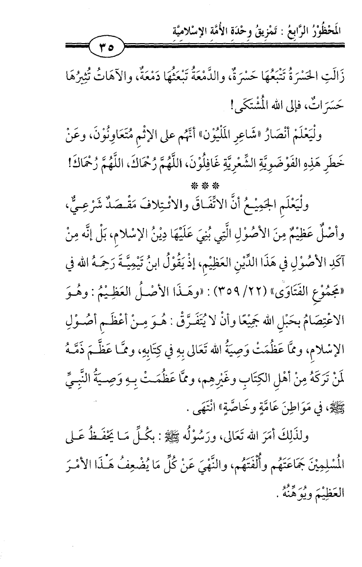 ولْيَعْلَمِ الجَمِيْعُ أنَّ الاتِّفَاقَ والائْتِلافَ مَقْصَدٌ شَرْعِيٌّ، وأصْلٌ عَظِيْمٌ مِنَ الأصُوْلِ الَّتِي بُنِيَ عَلَيْهَا دِيْنُ الإسْلامِ، بَلْ إنَّه مِنْ آكَدِ الأصُوْلِ في هَذَا الدِّيْنِ العَظِيْمِ، إذْ يَقُوْلُ ابنُ تَيْمِيَّةَ رَحِمَهُ الله في «مَجمُوْعِ الفَتَاوَى» (22/ 359): «وهَذَا الأصْلُ العَظِيْمُ: وهُوَ الاعْتِصَامُ بحَبْلِ الله جَمِيْعًا وأنْ لا يُتَفَرَّقْ: هُوَ مِنْ أعْظَمِ أصُوْلِ الإسْلامِ، وممَّا عَظُمَتْ وَصِيَةُ الله تَعَالى بِهِ في كِتَابِهِ، وممَّا عَظَّمَ ذَمَّهُ لمَنْ تَرَكَهُ مِنْ أهْلِ الكِتَابِ وغَيْرِهِم، وممَّا عَظُمَتْ بِهِ وَصِيَةُ النَّبِيِّ - صلى الله عليه وسلم -، في مَوَاطِنَ عَامَّةٍ وخَاصَّةٍ» انْتَهَى.