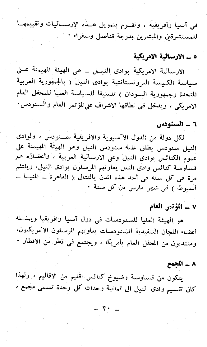 لكل دولة من الدول الآسيوية والأفريقية سنودس، ولوادي النيل سنودس يطلق عليه سنودس النيل وهو الهيئة المهيمنة على عموم الكنائس بوادي النيل وعلى الإرسالية العربية، وأعضاؤه هم قساوسة كنائس وادي النيل يعاونهم المرسلون بوادي النيل، ويلتئم مرة في كل سنة في أحد هذه المدن بالتتالي (القاهرة - المنيا - أسيوط) في شهر مارس من كل سنة.