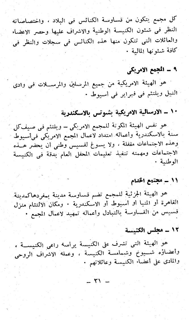 كل مجمع يتكون من قساوسة الكنائس في البلاد، واختصاصاته النظر في شئون الكنيسة الوطنية والإشراف عليها وحصر الأعضاء والعائلات التي تتكون منها هذه الكنائس في سجلات والنظر في كافة شئونها المالية.