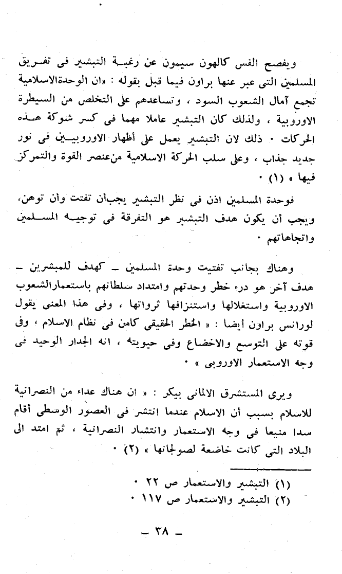 فوحدة المسلمين إذن في نظر التبشير يجب أن تفتت وأن توهن، ويجب أن يكون هدف التبشير هو التفرقة في توجيه المسلمين وإتجاهاتهم.