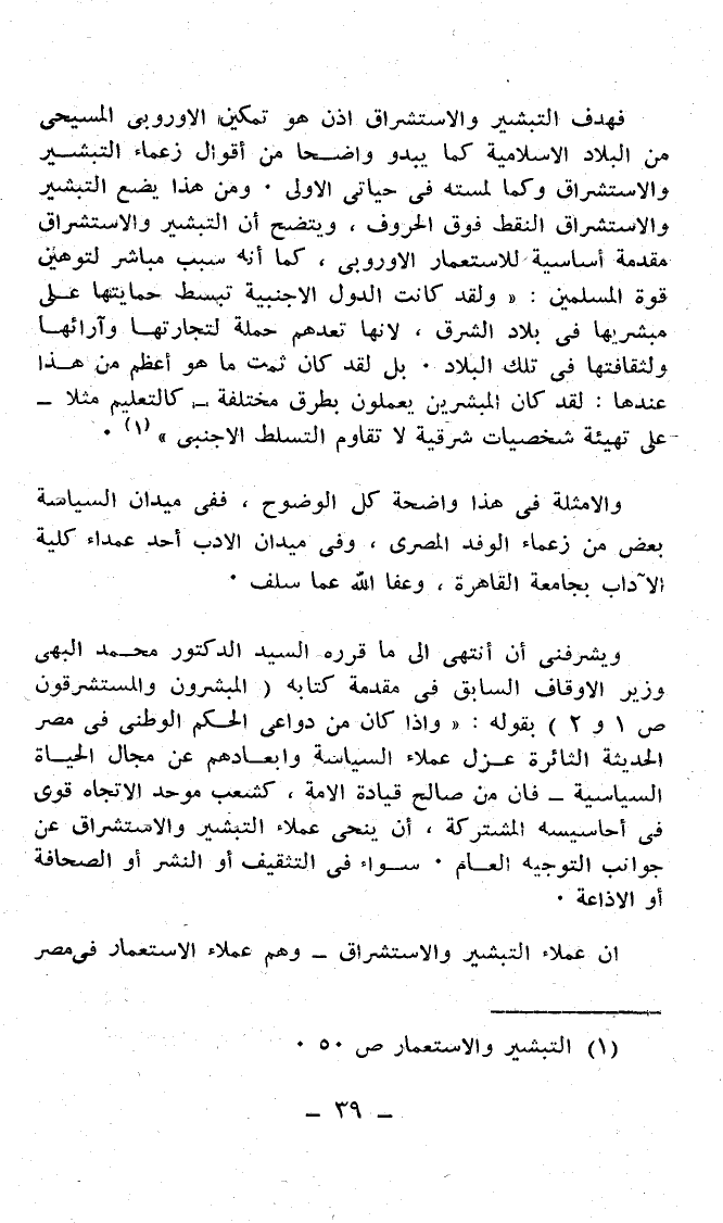 ويشرفني أن أنتهي إلى ما قرره السيد الدكتور محمد البهي وزير الأوقاف السابق في مقدمة كتابه (المبشرون والمستشرقون ص 1 و2) بقوله: "وإذا كان من دواعي الحكم الوطني في مصر الحديثة الثائرة عزل عملاء السياسة وإبعادهم عن مجال الحياة السياسية - فإن من صالح قيادة الأمة، كشعب موحد الإتجاه قوي في أحاسيسه المشتركة، أن ينحي عملاء التبشير والاستشراق عن جوانب التوجيه العام. سواء في التثقيف أو النشر أو الصحافة أو الإذاعة.