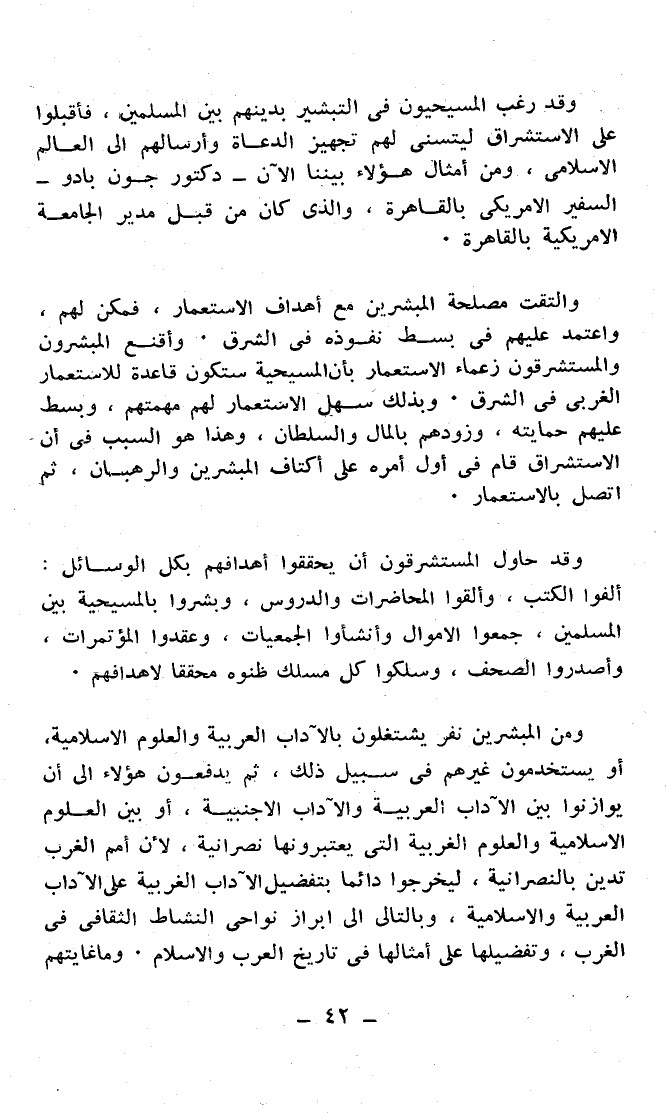ومن المبشرين نفر يشتغلون بالآداب العربية والعلوم الإسلامية، أو يستخدمون غيرهم في سبيل ذلك، ثم يدفعون هؤلاء إلى أن يوازنوا بين الآداب العربية والآداب الأجنبية، أو بين العلوم الإسلامية والعلوم الغربية التي يعتبرونها نصرانية، لأن أمم الغرب تدين بالنصرانية، ليخرجوا دائماً بتفضيل الآداب الغربية على الآداب العربية والإسلامية، وبالتالي إلى إبراز نواحي النشاط الثقافي في الغرب، وتفضيلها على أمثالها في تاريخ العرب والإسلام، وما غايتهم
